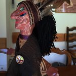 Les cheveux sont en laine préalablement montés comme pour une perruque puis collés très solidement sur la tête ; elle peut être coiffée et les cheveux ne tombent pas. Elle possède aussi une coiffe en plumes