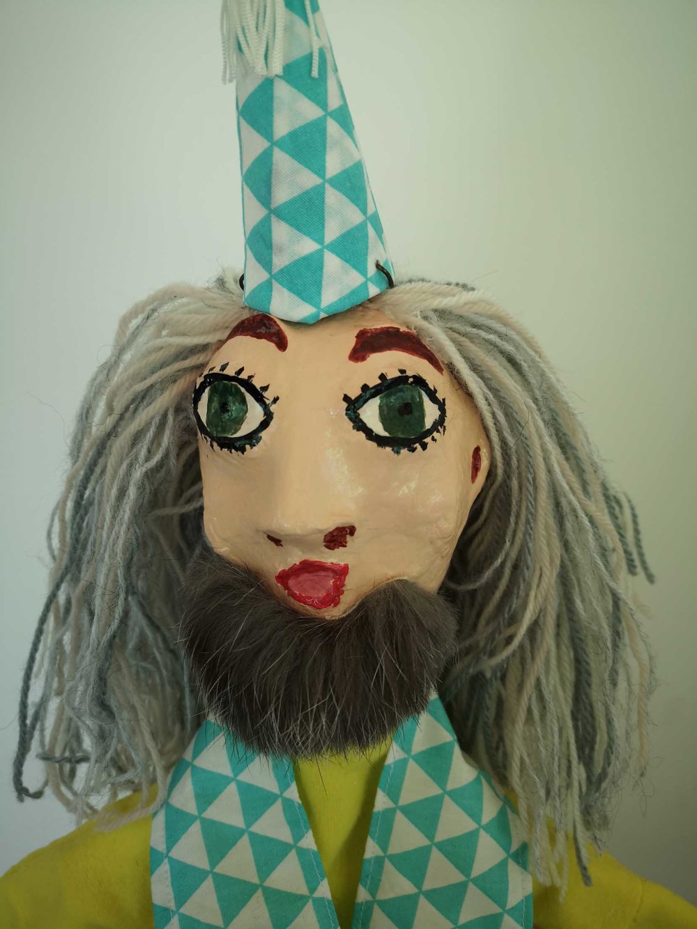 Les cheveux sont en laine préalablement montés comme pour une perruque puis collés très solidement sur la tête ; elle peuvent être coiffée et les cheveux ne tombent pas. Son chapeau pointu est enlevable .