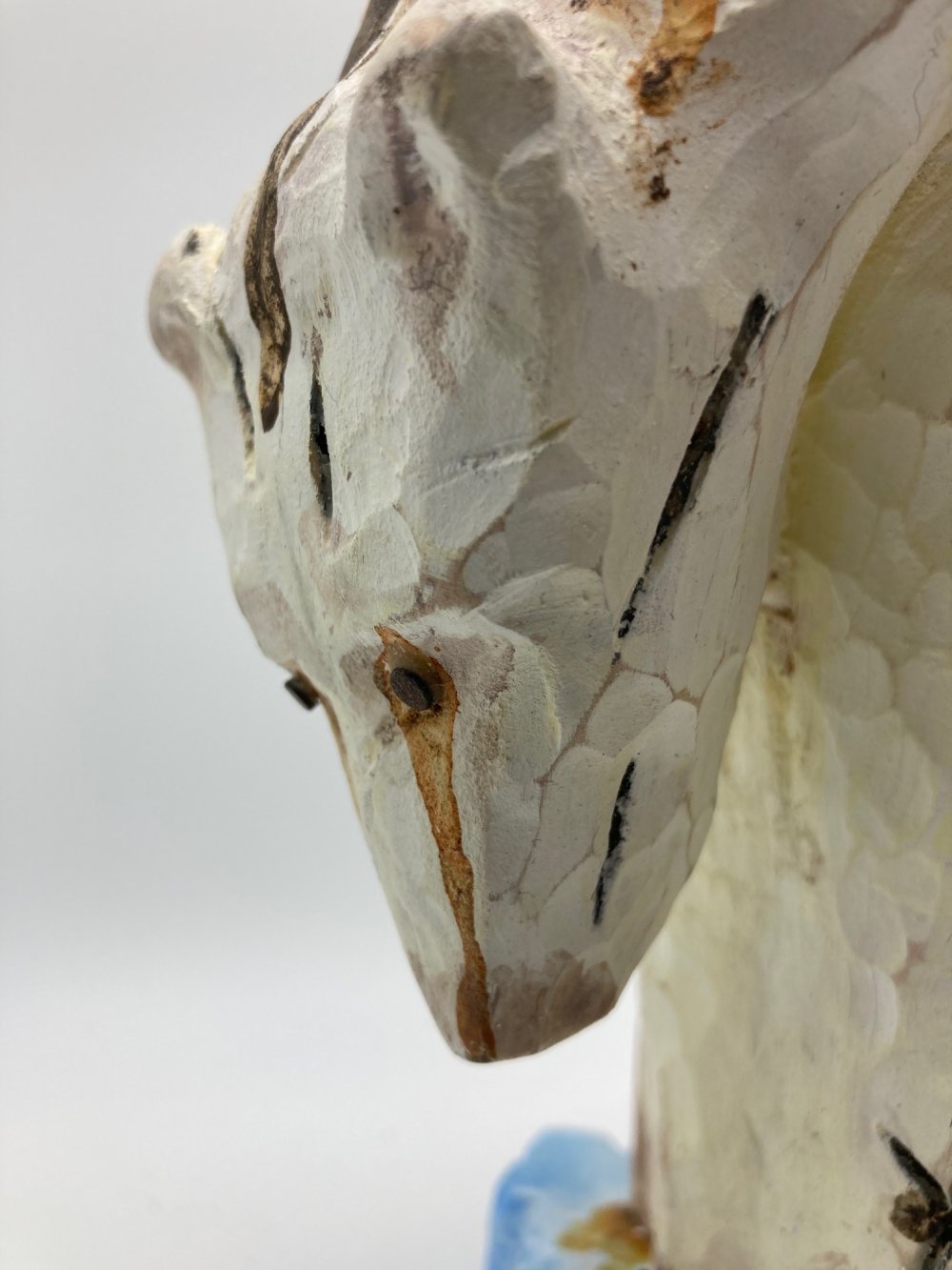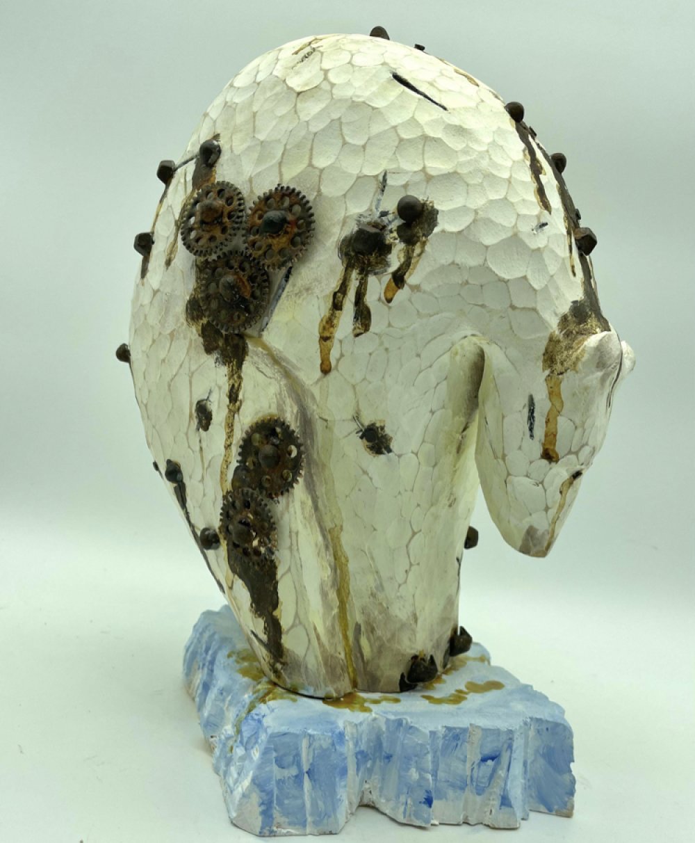 Sculpture en bois de tilleul recouverte de patine acrylique, d'oxyde de fer, coulures de corrosion, engrenages et vieux clous anciens.