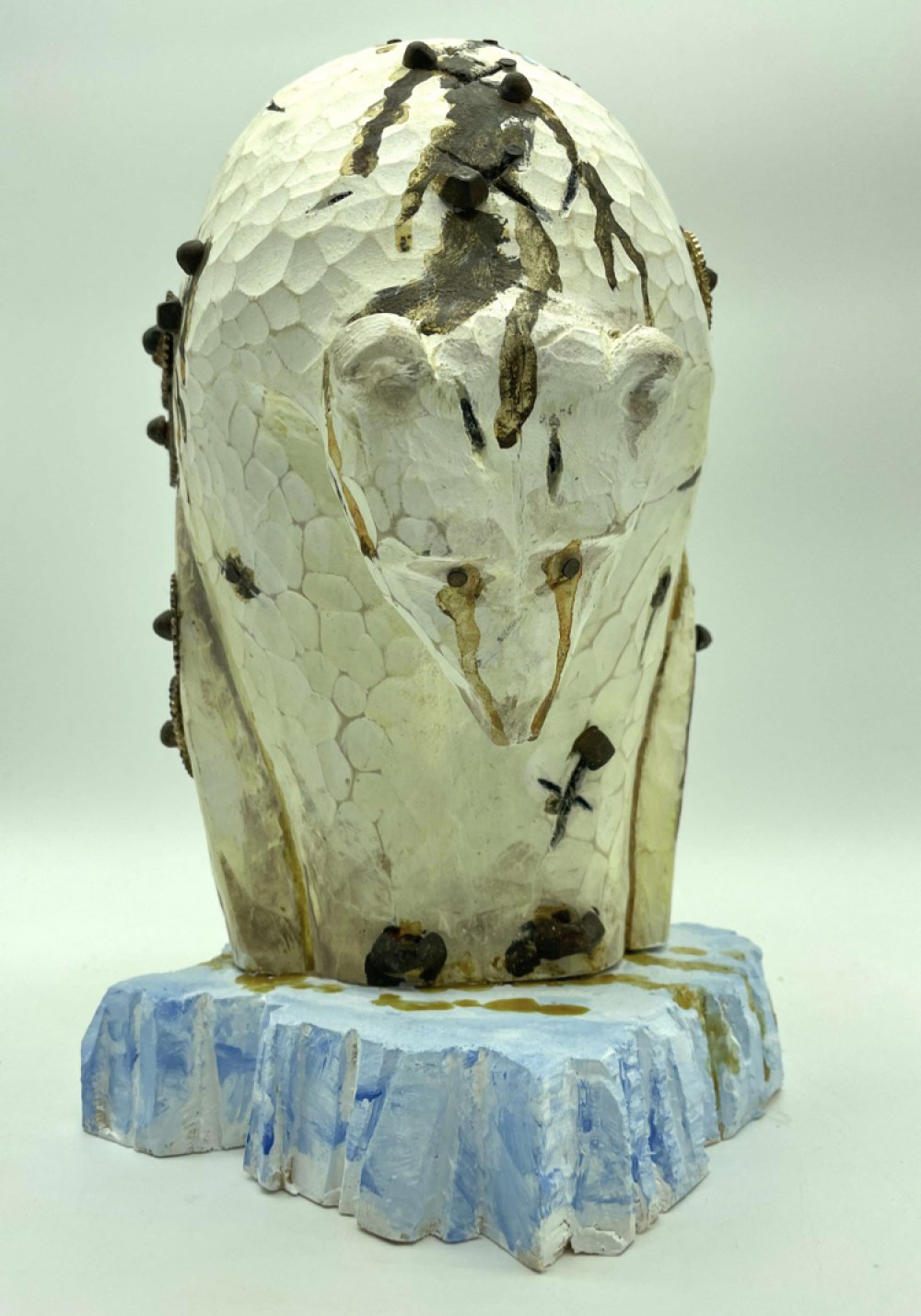 Sculpture d'un ours polaire sur le peu d'iceberg qu'il lui reste.