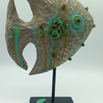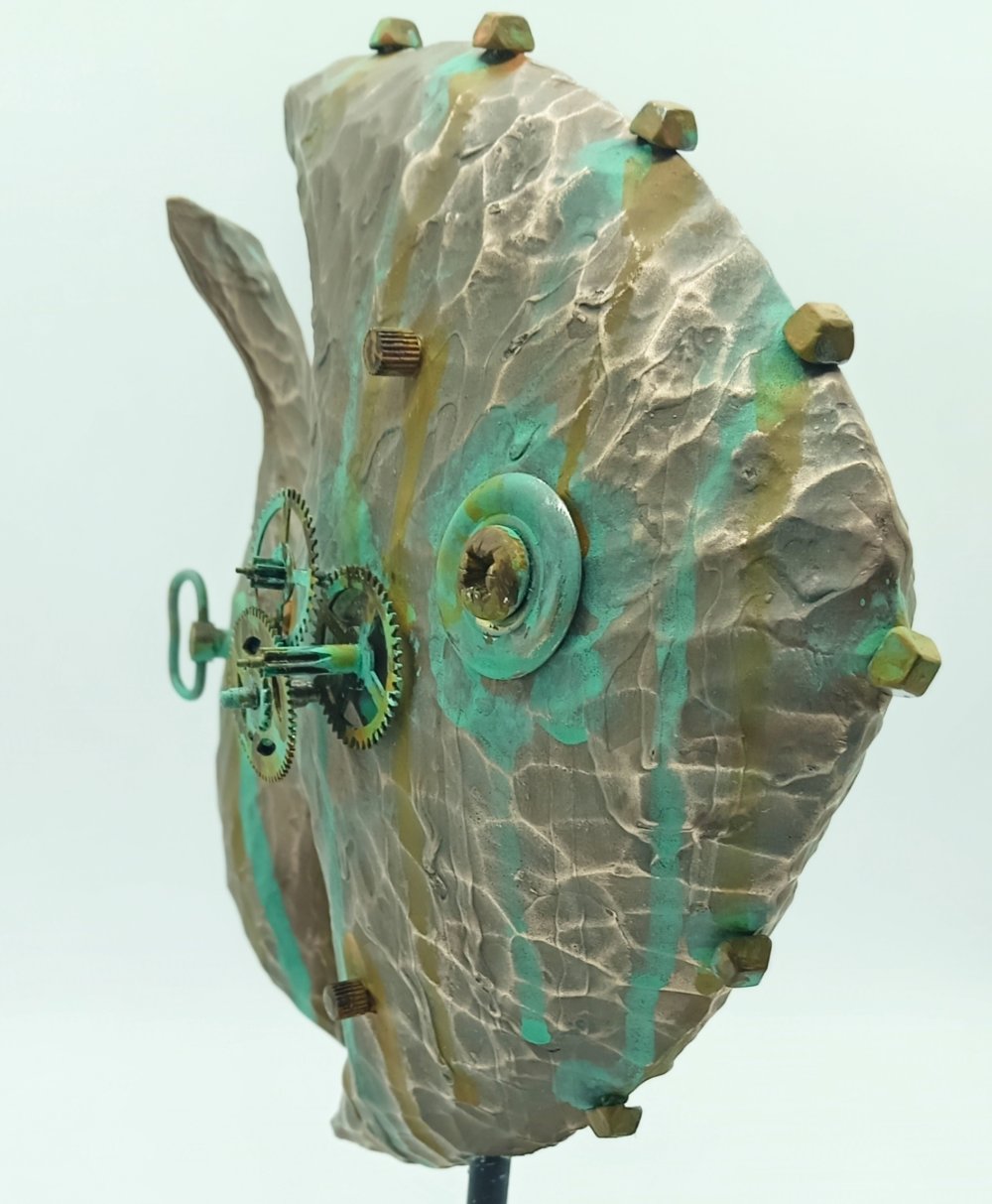 Poisson industriel mécanique recouvert d'oxyde de bronze et de patine vert de gris, habillé de rouages et d'engrenages de vieux réveils, de boulons, de vis et de clous anciens.