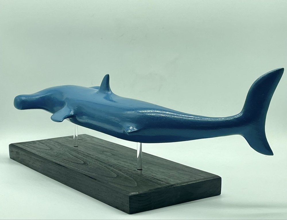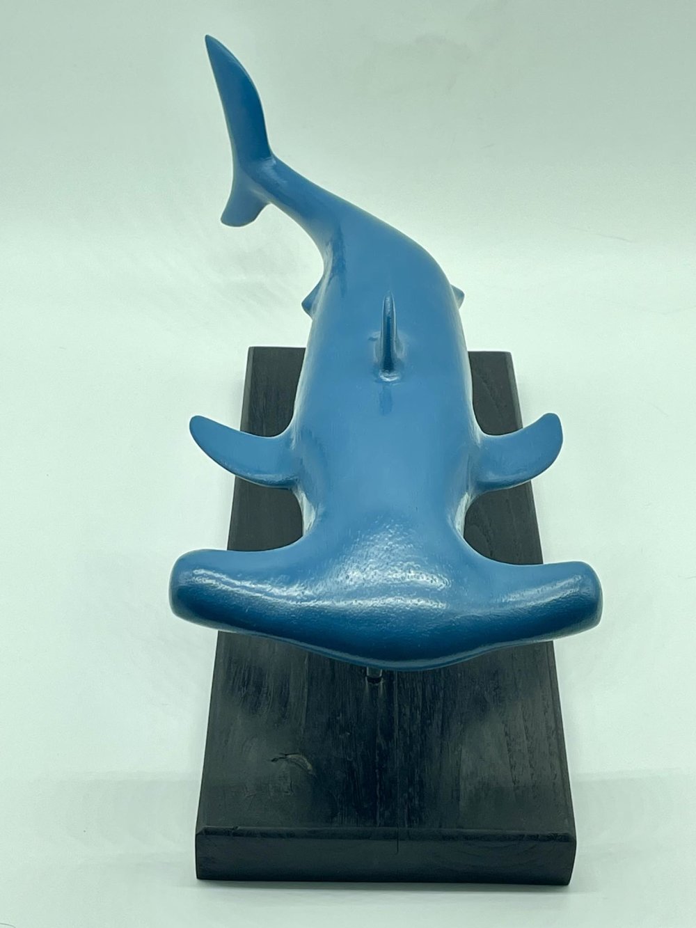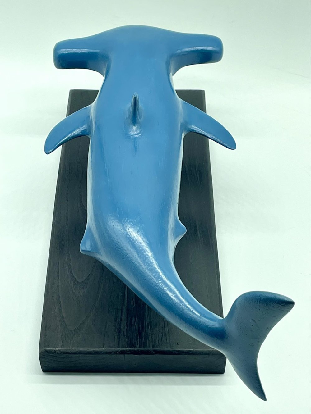Sculpture d'un requin-marteau en bois peint bleu laqué.