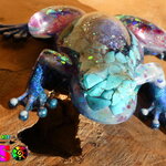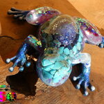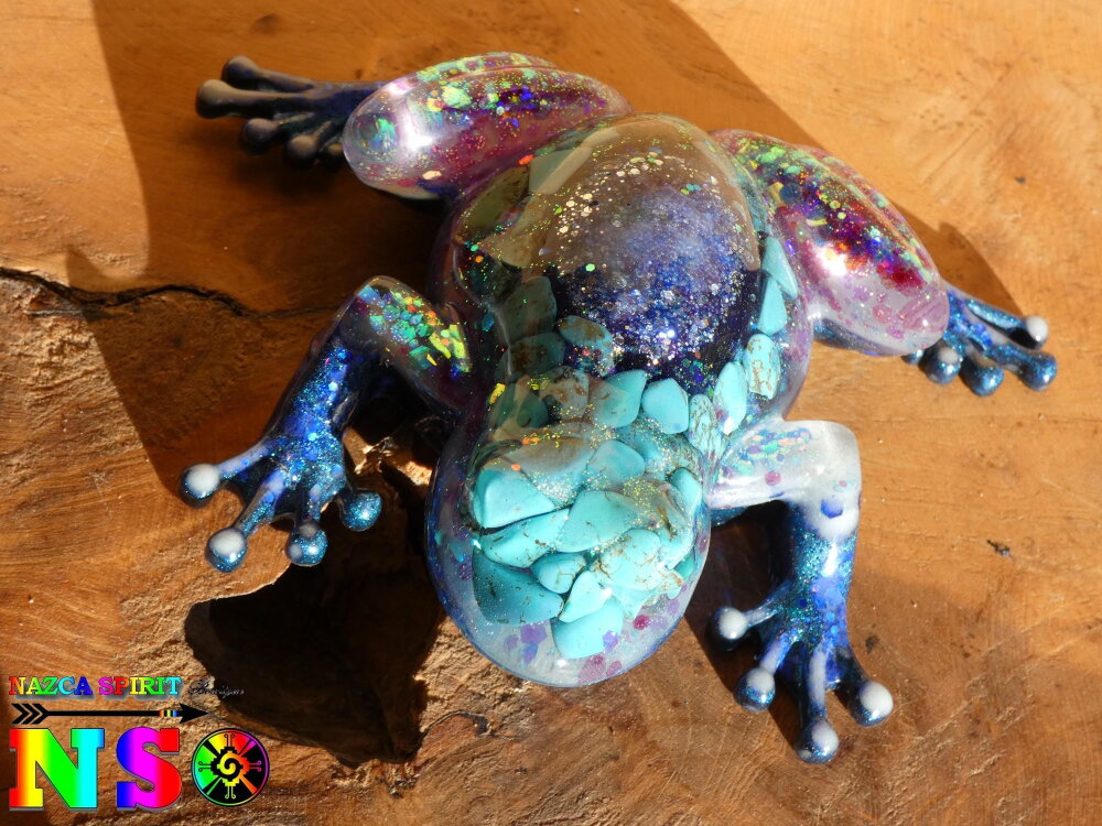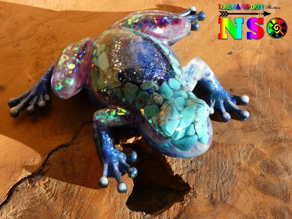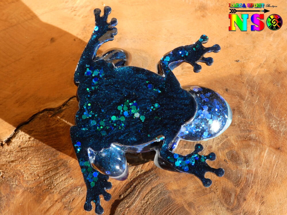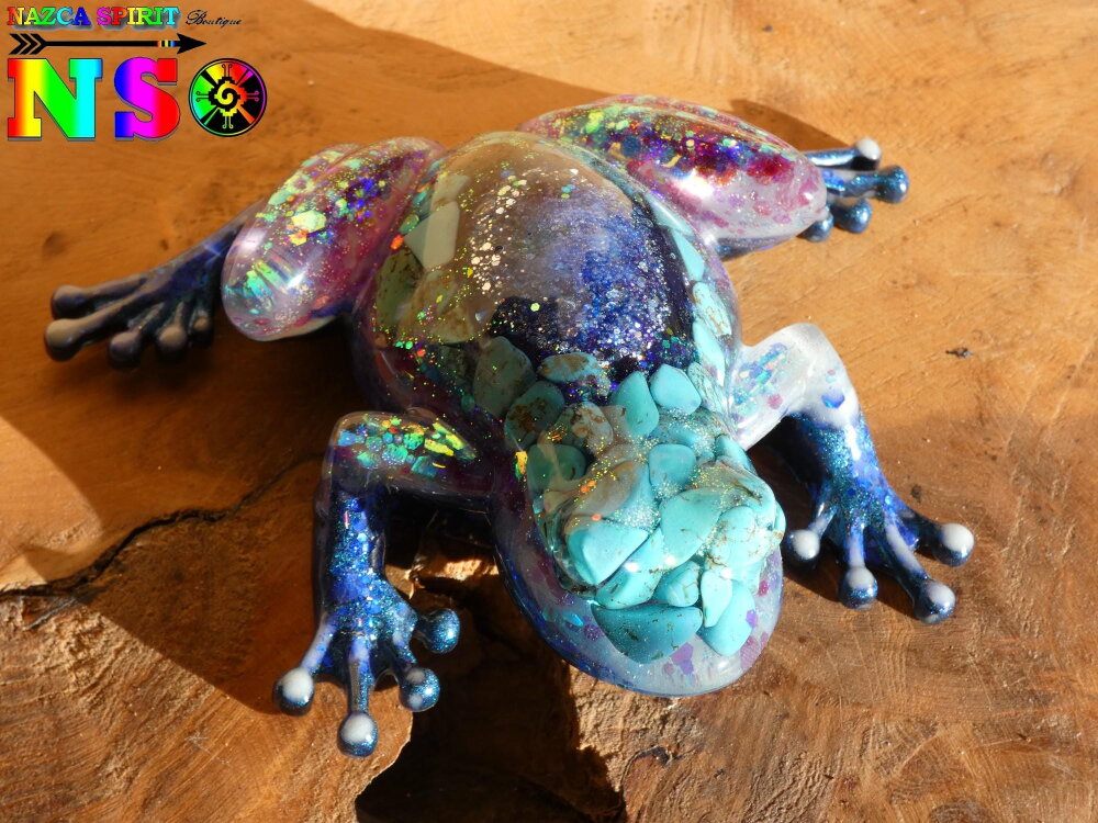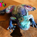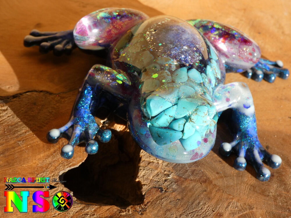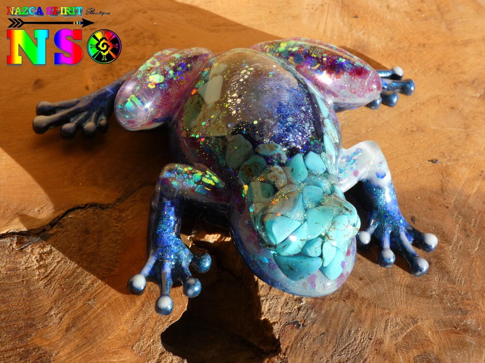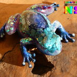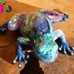 Je vous propose une création artistique intégralement réalisée à la main. Il s'agit d'une adorable grenouille conçue à partir de résine cristal (Origine de la résine : Allemagne), de pierres fines achetées aux 4 coins de la planète, de colorants, de pigments iridescents et de poudres luminescentes.