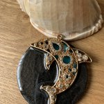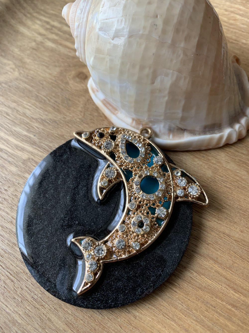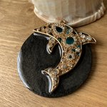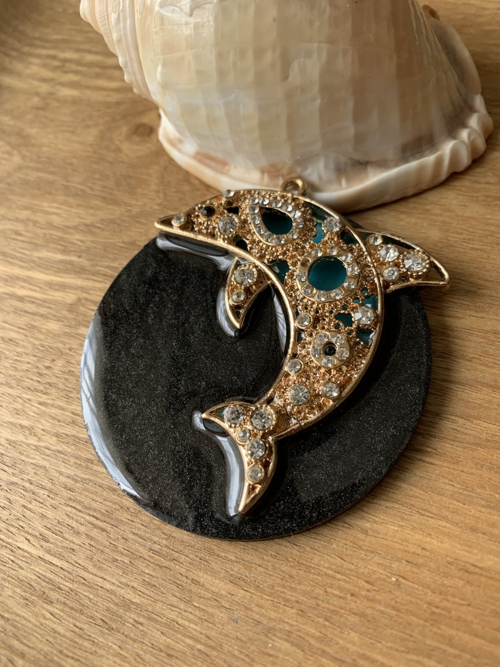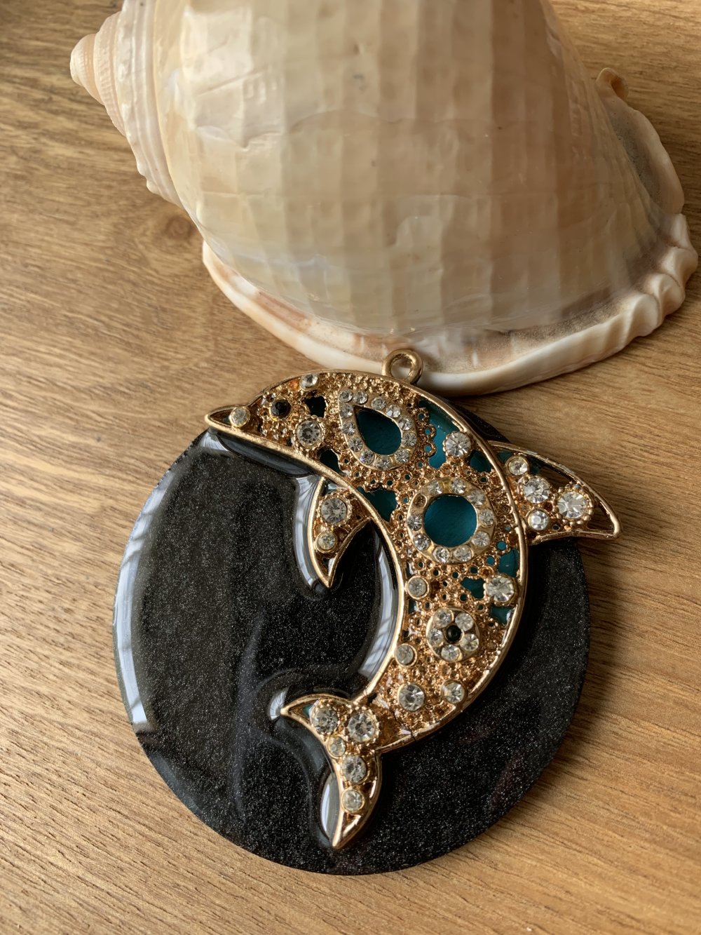Gros pendentif dauphin strass sur bois résiné noir nacré 63 mm,