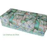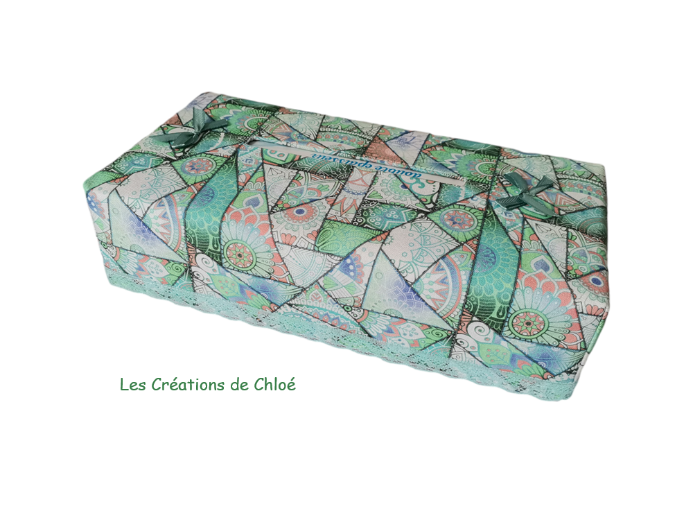 Tissu coton à motifs géométriques, entourage en dentelle de couleur verte et 2 petits nœuds papillon sur le dessus