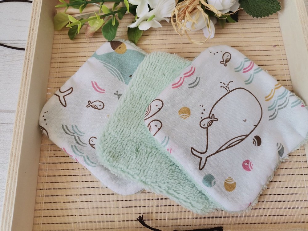Une face coton certifié Oeko-Tex motifs animaux de la mer et l'autre face en éponge bambou de couleur vert d'eau