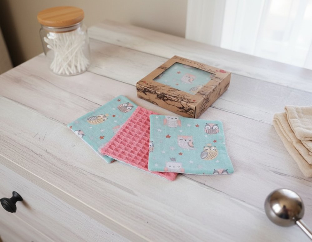 Un peu de douceur pour le change de bébé avec ce lot de 8 lingettes lavables dans leur boite cadeau