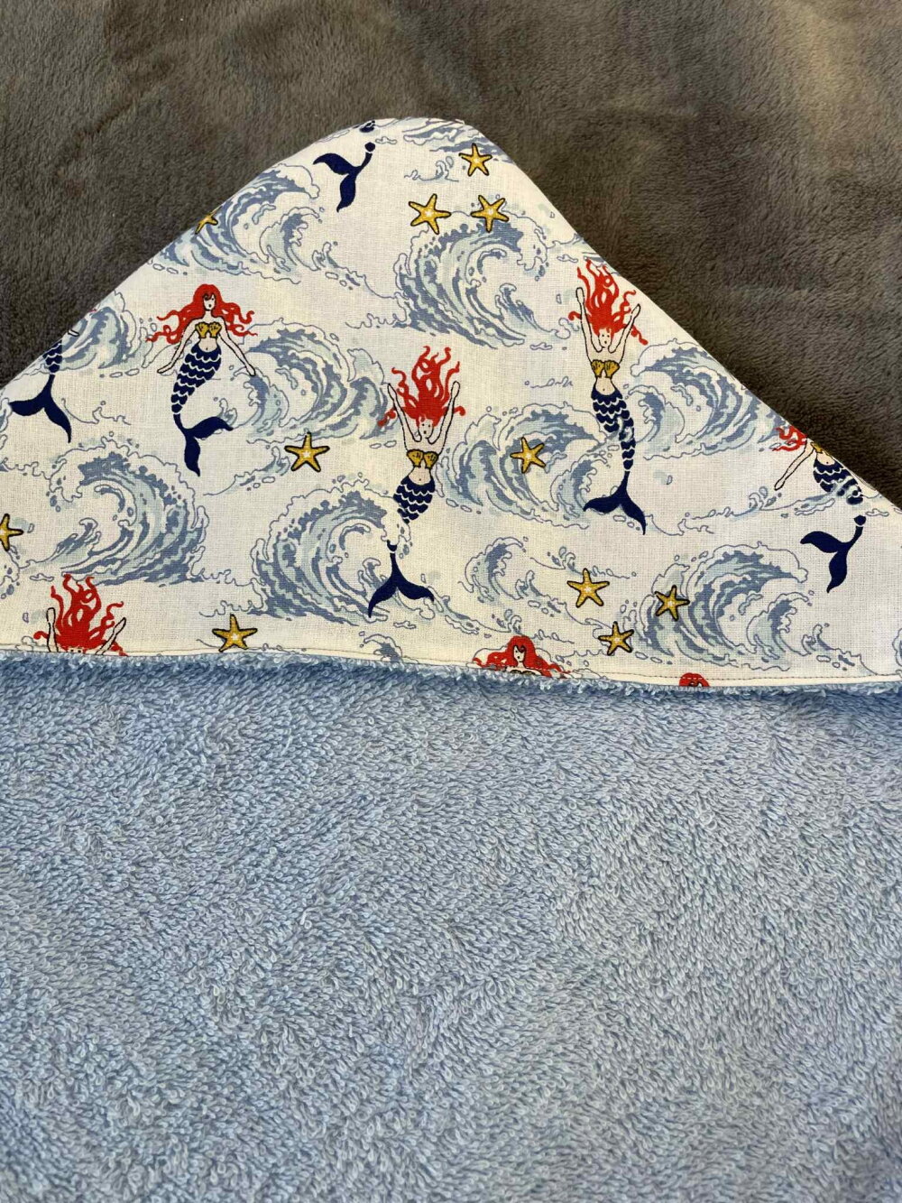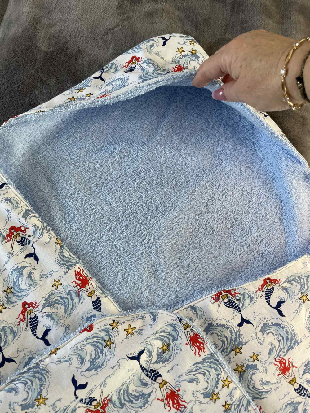 Cape de bain bébé en éponge et coton – Modèle sirène & vagues