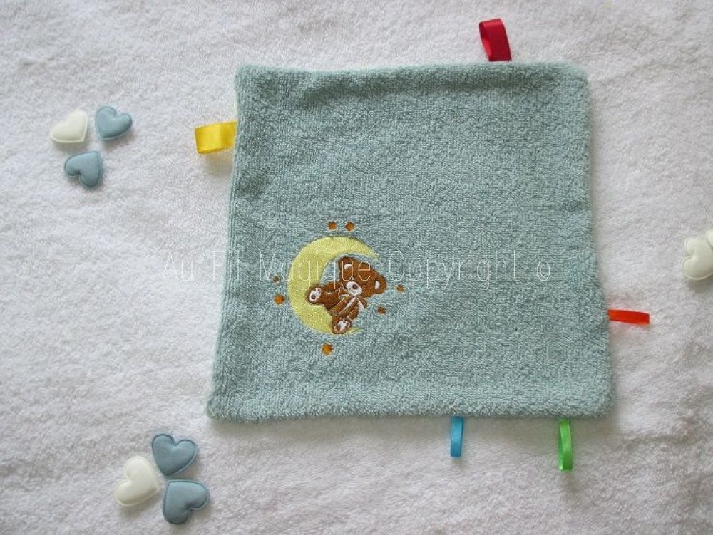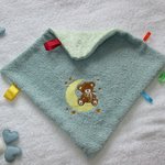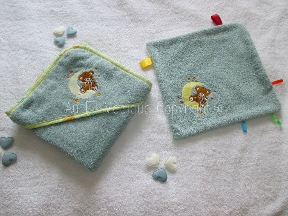 Sortie de Bain et Doudou couleur Vert Jade "Ourson sur la lune" Fait-main Taille Naissance à 12 mois