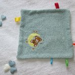 Petits rubans de couleurs assorties tout autour du Doudou. Envers du doudou en Panne de velours Vert Pastel.