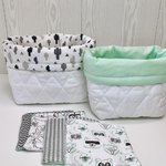 En tissu matelassé blanc à l'extérieur et doublé en tissu coton vert menthe clair pour l'une et imprimé cactus pour l'autre à l'intérieur. Consistance souple tout en ayant une bonne tenue grâce au tissu matelassé.
