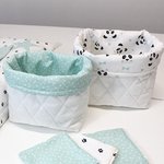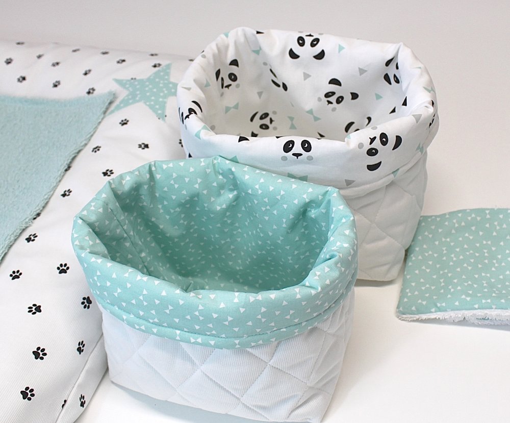 En tissu matelassé blanc à l'extérieur et doublé en tissu coton vert d'eau à motifs pour l'une et imprimé pandas pour l'autre à l'intérieur. Consistance souple tout en ayant une bonne tenue grâce au tissu matelassé.
