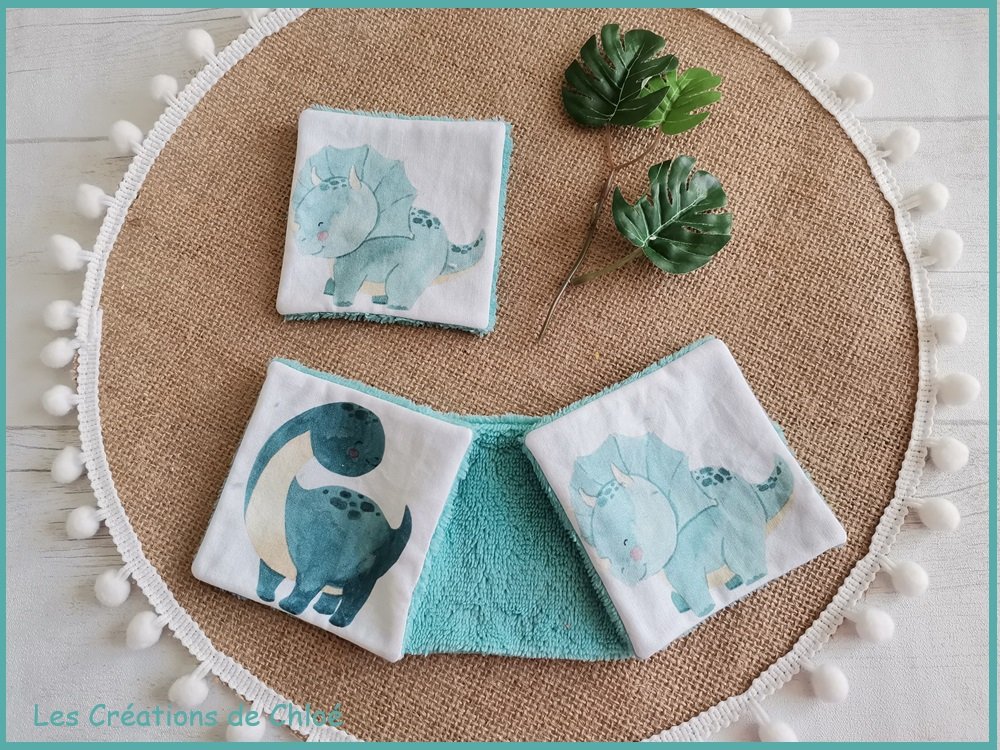 Une face coton certifié Oeko-Tex motifs imprimé dinosaures, et l'autre face en tissu éponge bambou de couleur vert turquoise