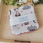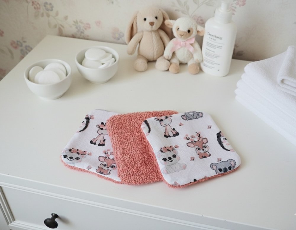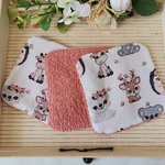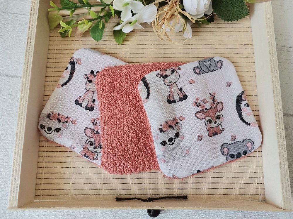 Une face coton certifié Oeko-Tex motifs bébé animaux et l'autre face en éponge de couleur saumon