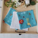 Une face coton certifié Oeko-Tex motifs animaux et l'autre face en tissu éponge de couleur blanche