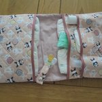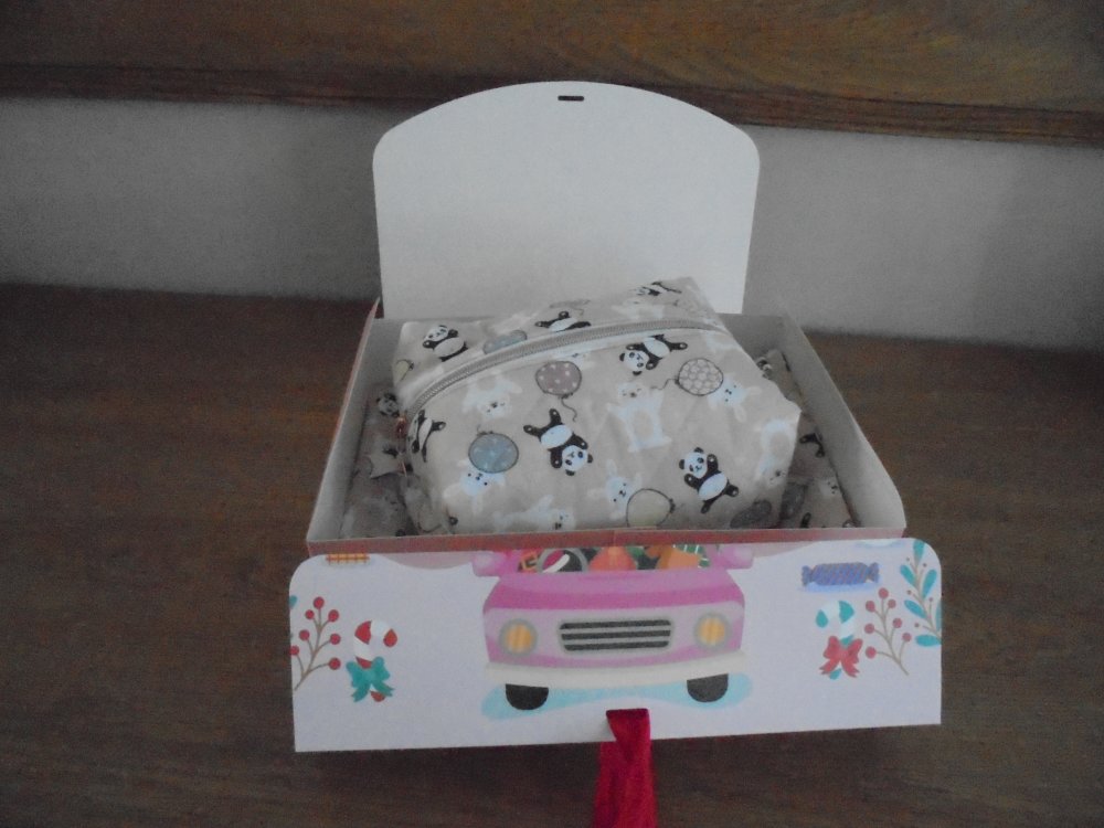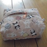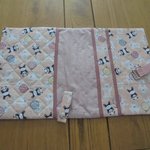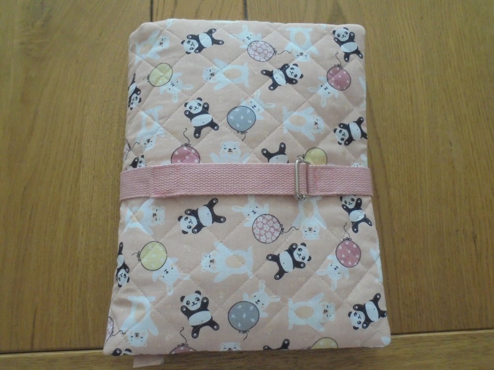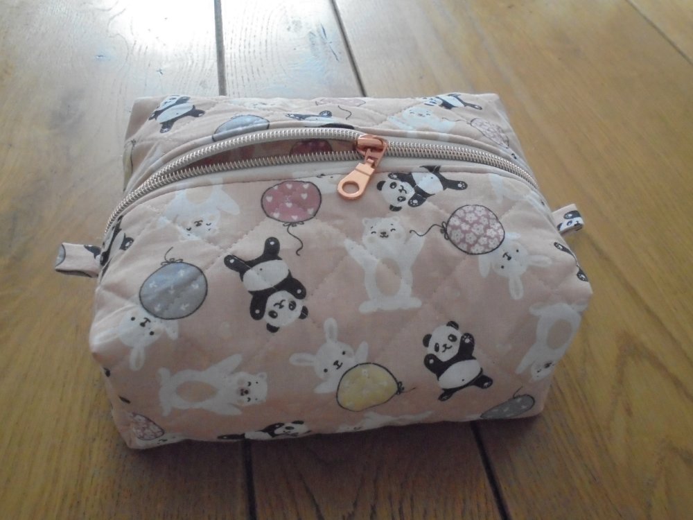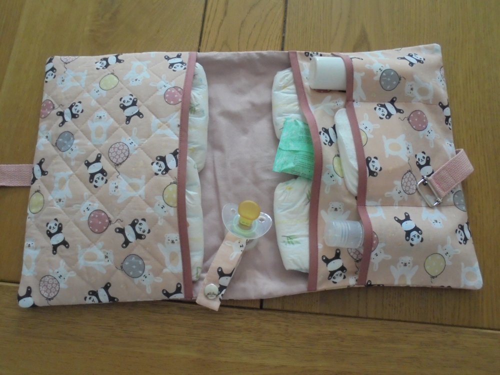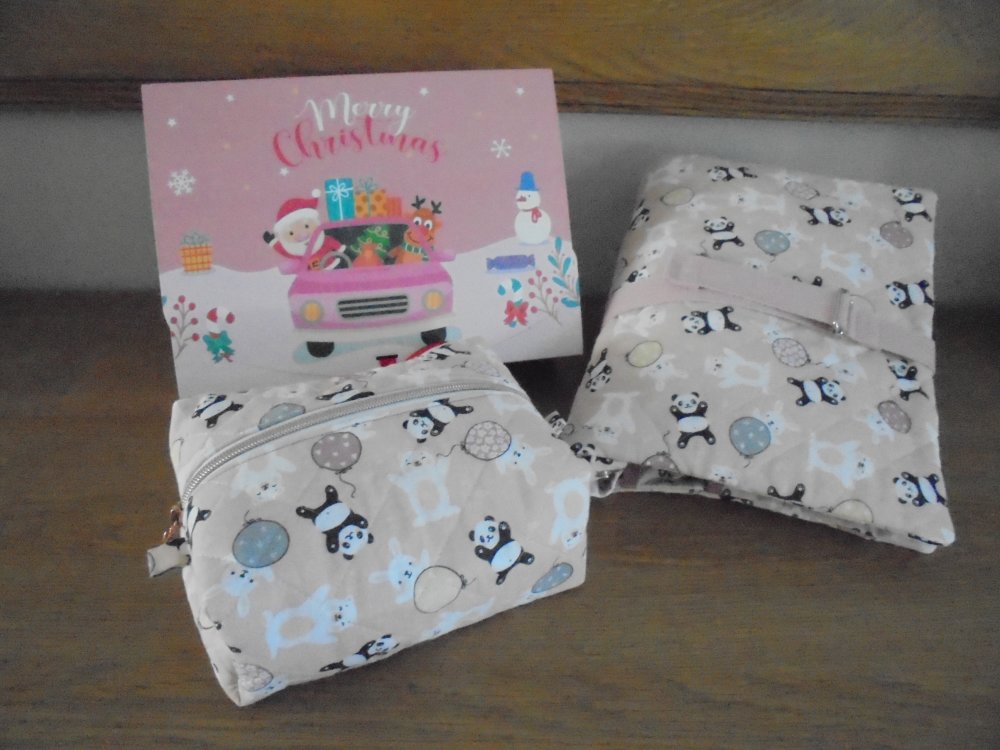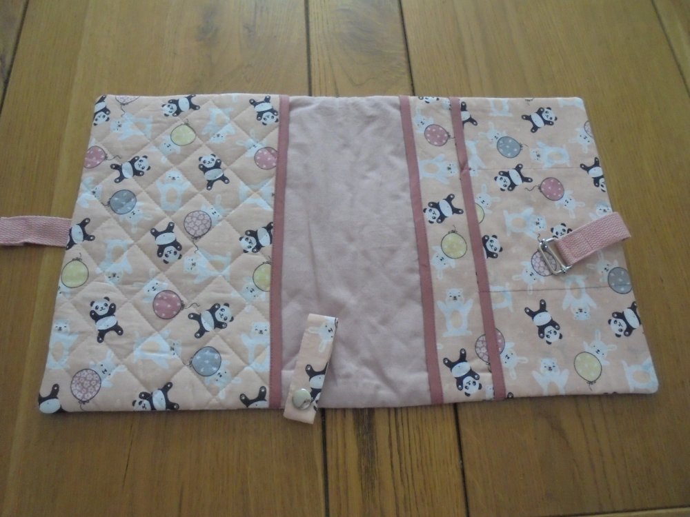 Je vous propose une pochette à langer nomade et sa trousse de toilette cousue avec du tissu matelassé certifié Oeko-tex " Panda Rose "