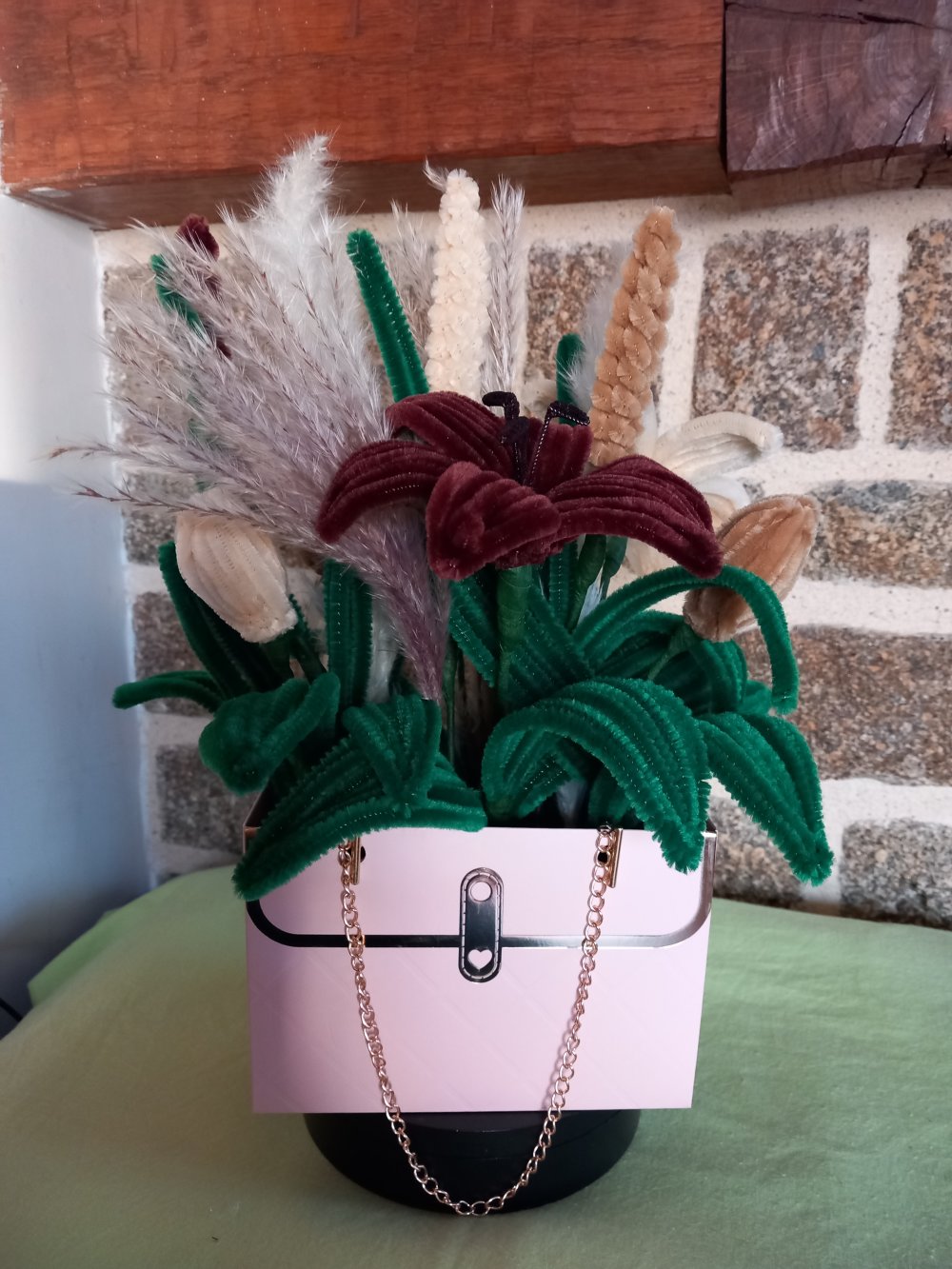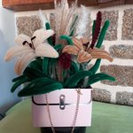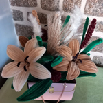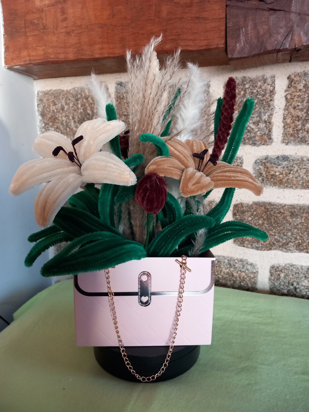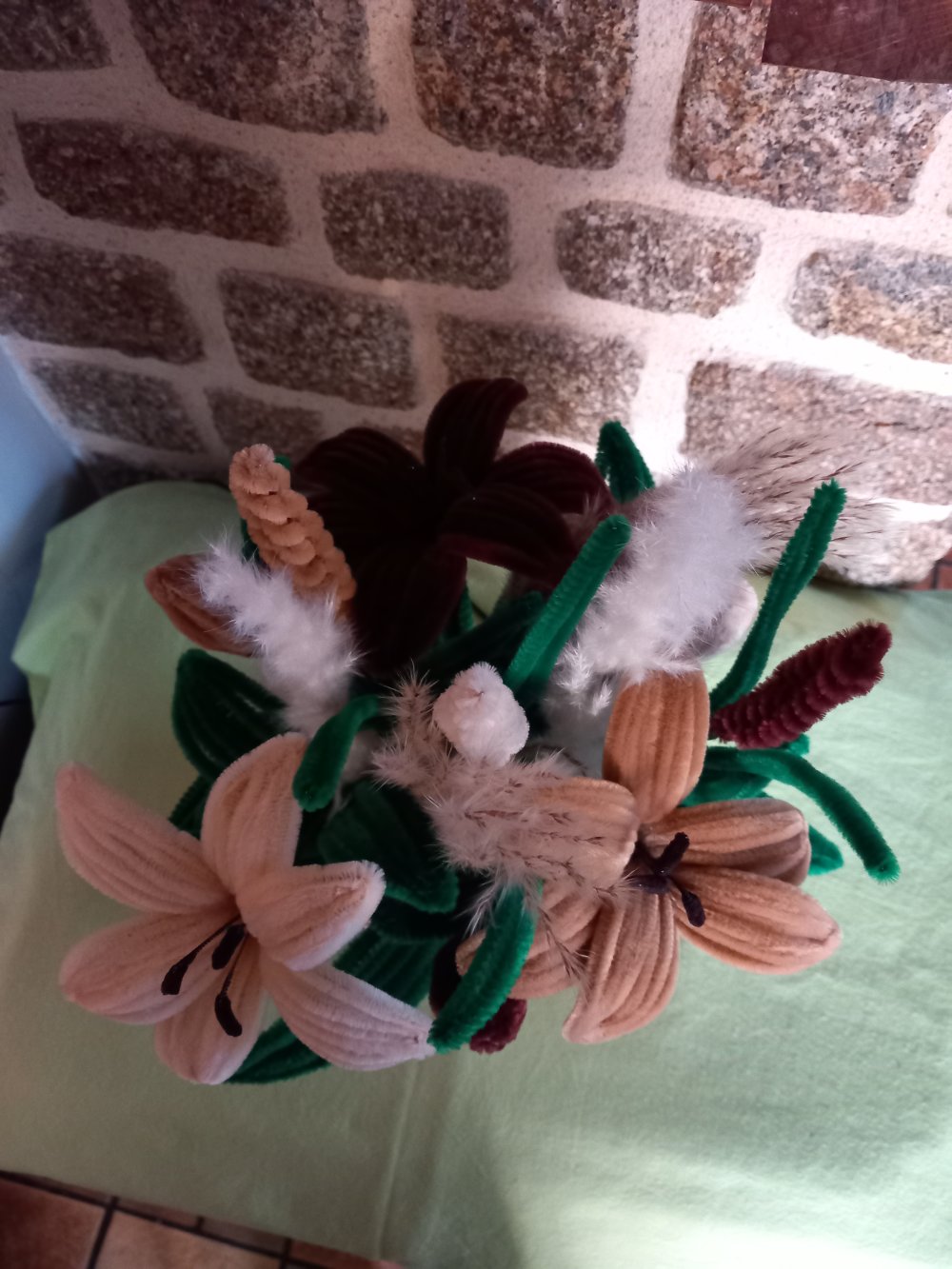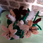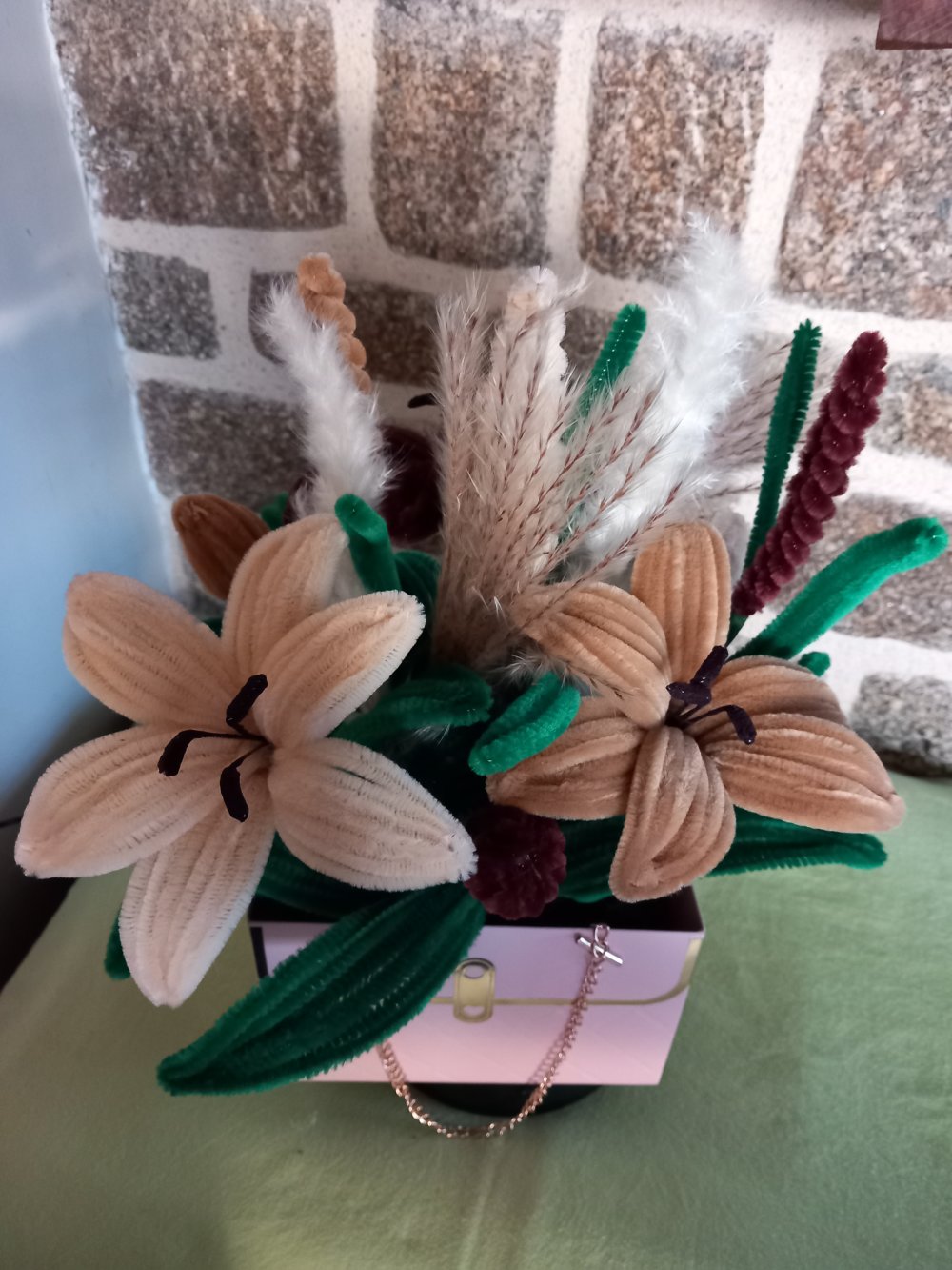 Composition de fleurs de lys en fil chenille avec leurs bourgeons et roseaux .