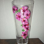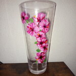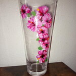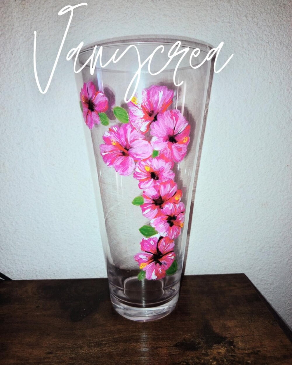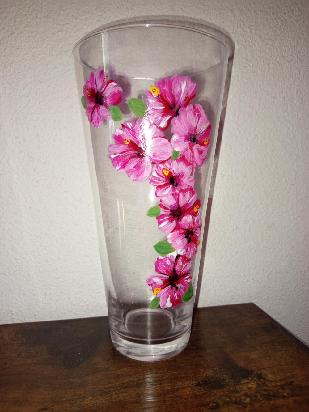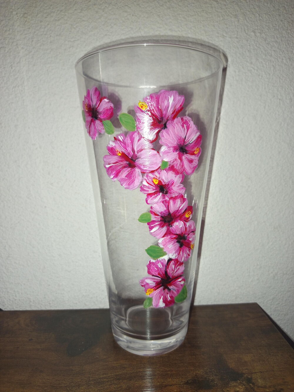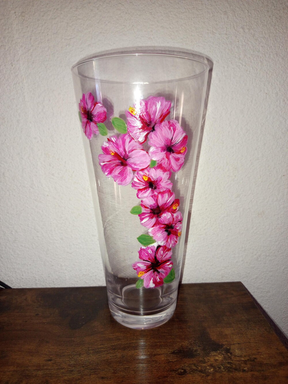 Vase fleurs hibiscus rose en verre peint à la main. Décoration de mariage / cadeau unique, peinture sur verre décoration maison idée cadeau