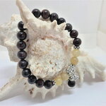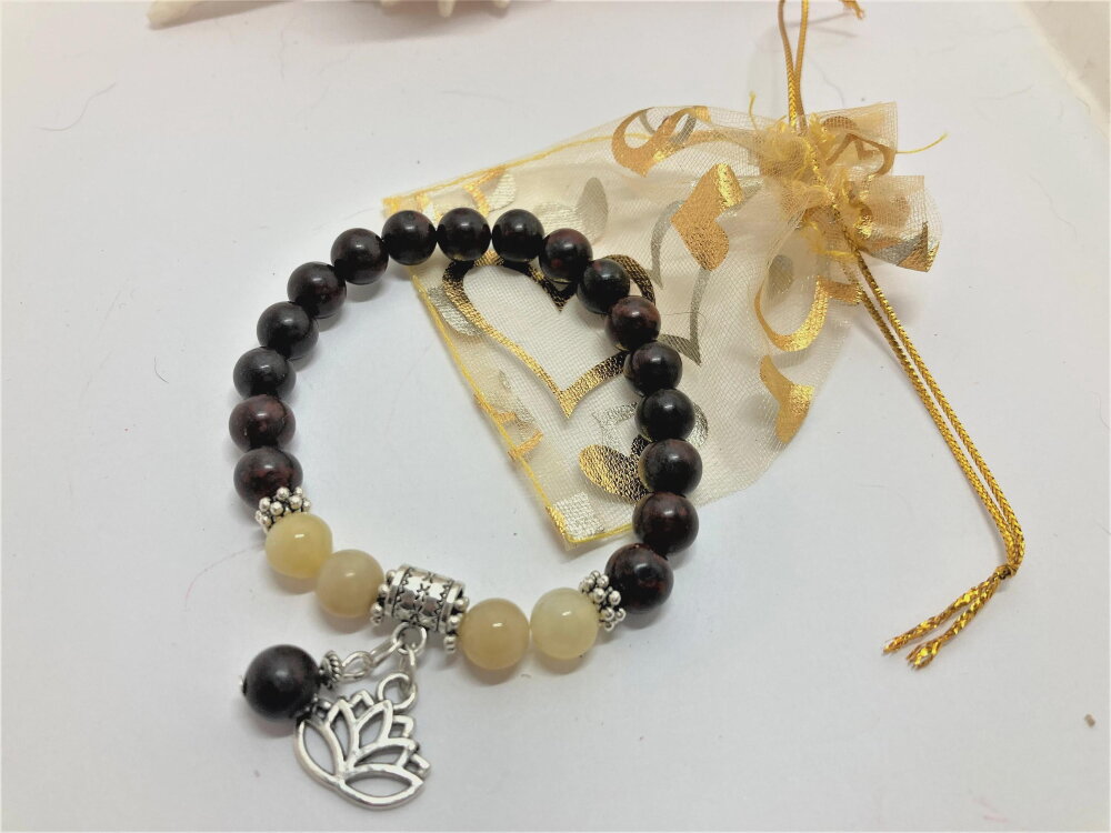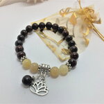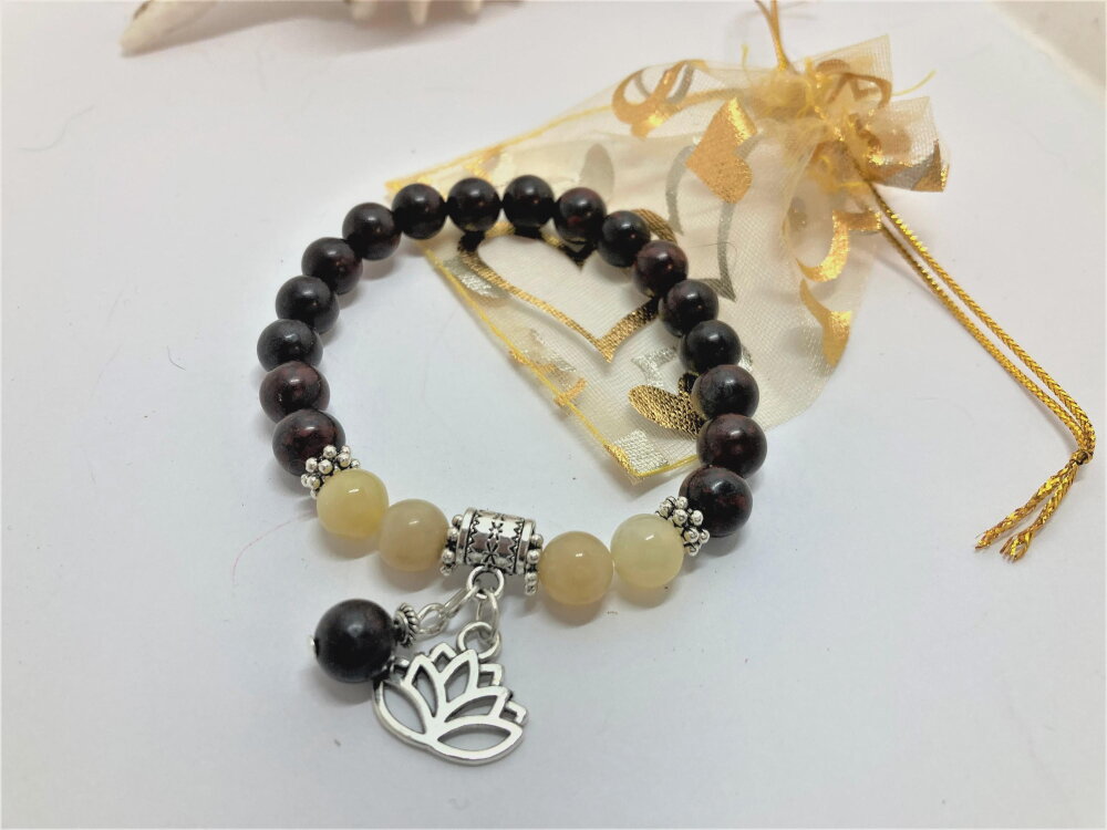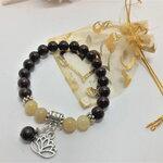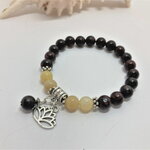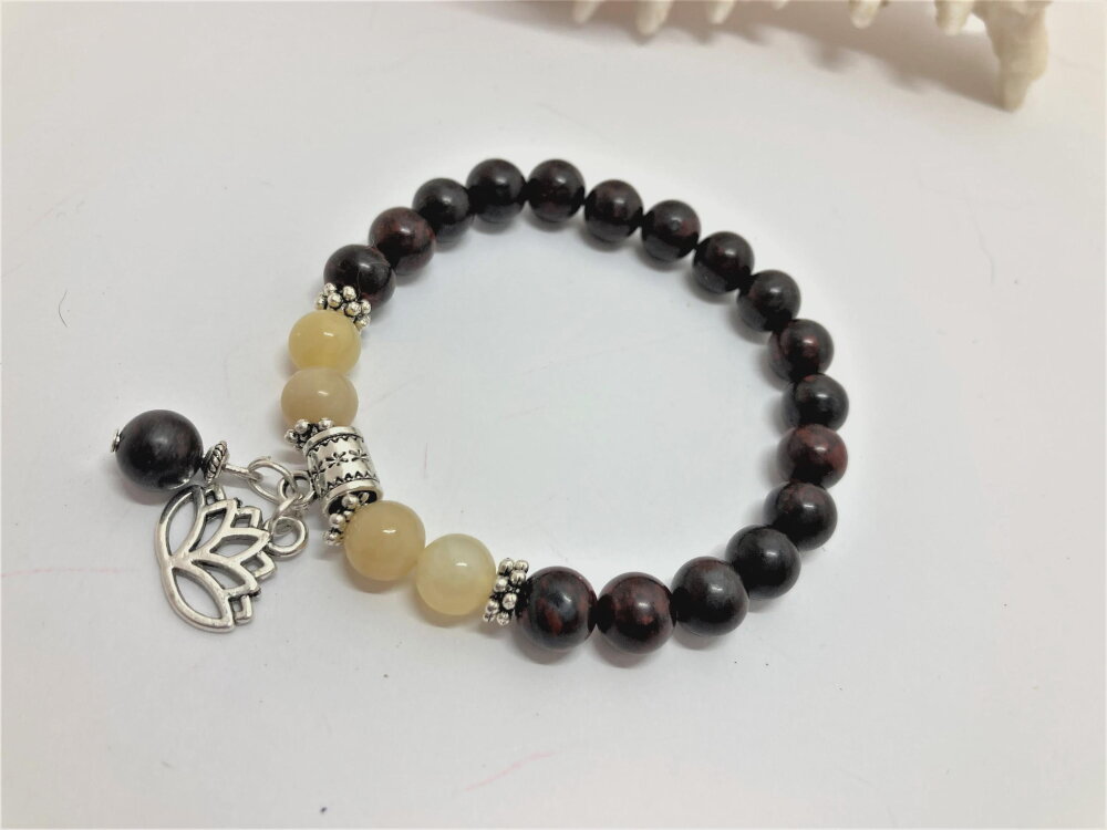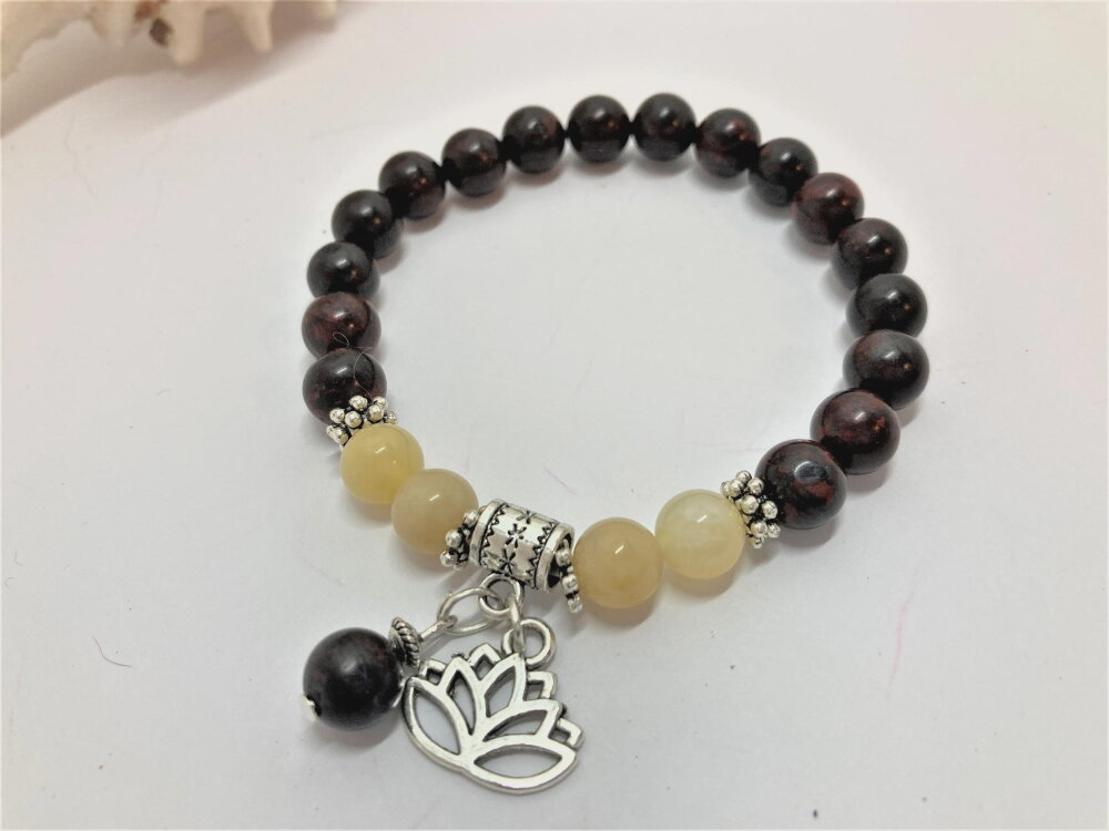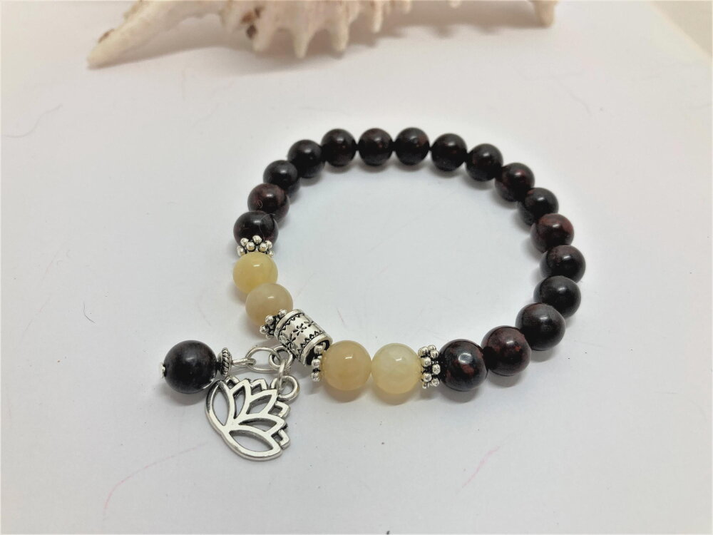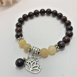 Bracelet perle ronde en jaspe marron de 8mm et perles en jade jaune de 8mm. Pierre semi-précieuse. Pendants fleur de lotus et 1 perle en jaspe de 8mm. intercalaires en argent tibétain.