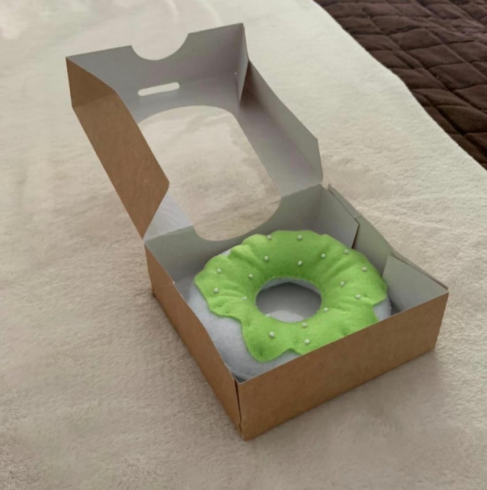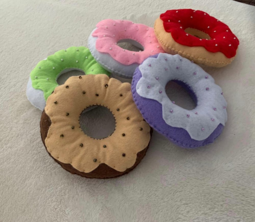 Donuts en feutrine blanc et vert, idéal pour jeu de dinette ou de marchande.