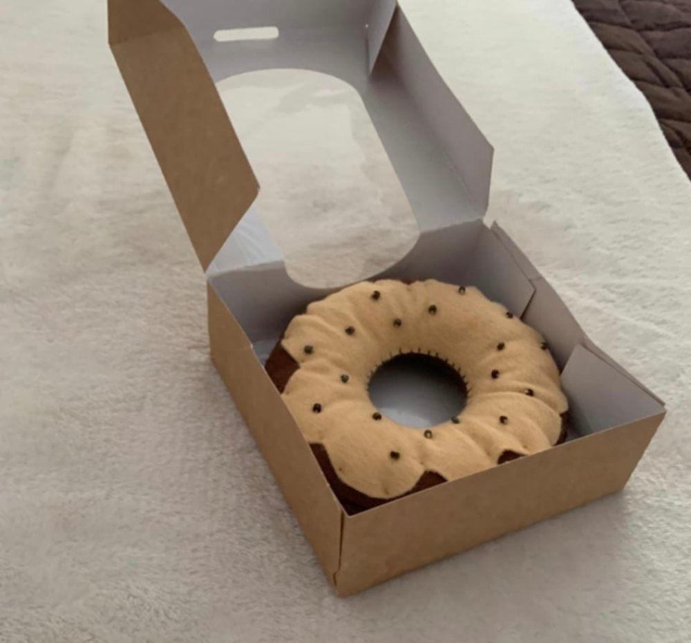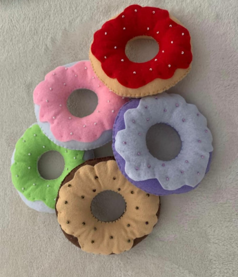 Donuts en feutrine beige et marron, idéal pour jeu de dinette ou de marchande.