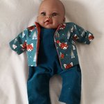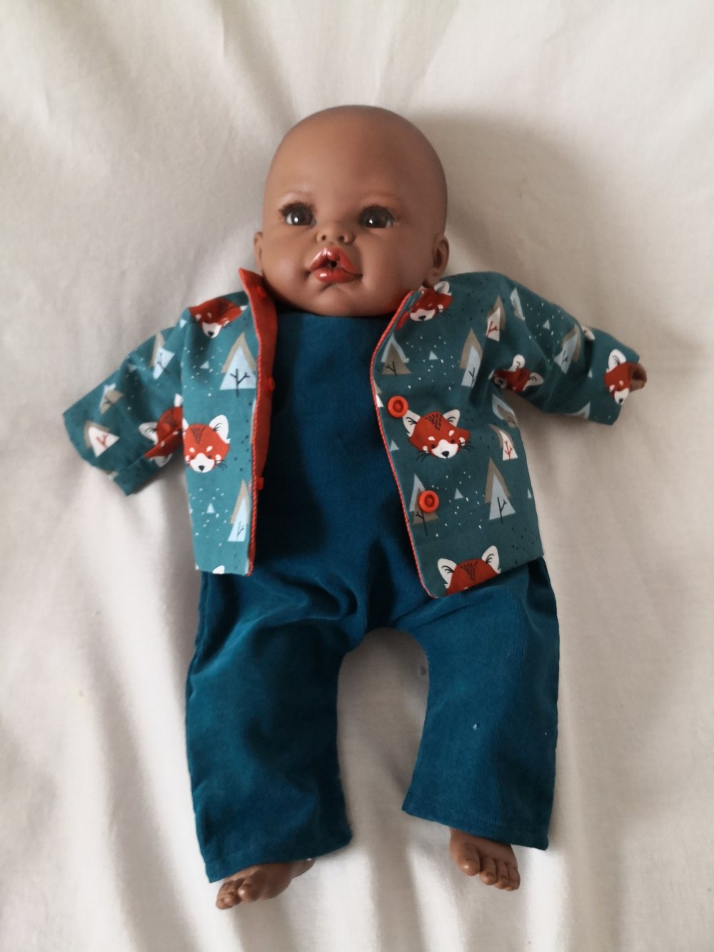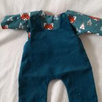 salopette velours vert foncé, chemise verte à motifs renard doublure orange '( réversible), fermeture par pression kam, pour poupon 40cm.