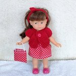 - une jupe en coton rouge à pois blancs (élastique à la taille) et son sac à main assorti,