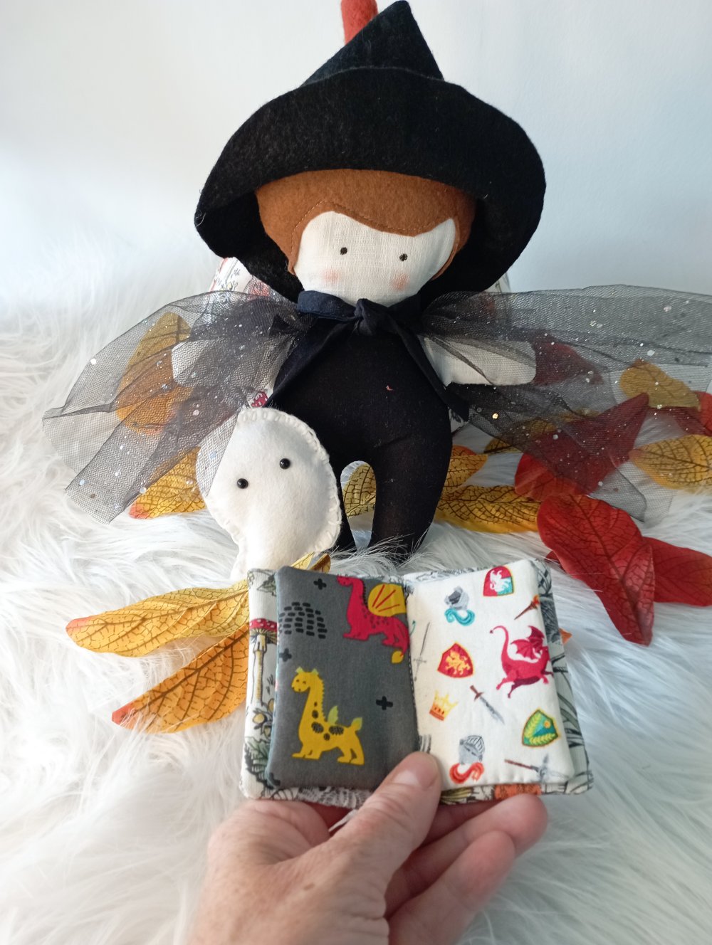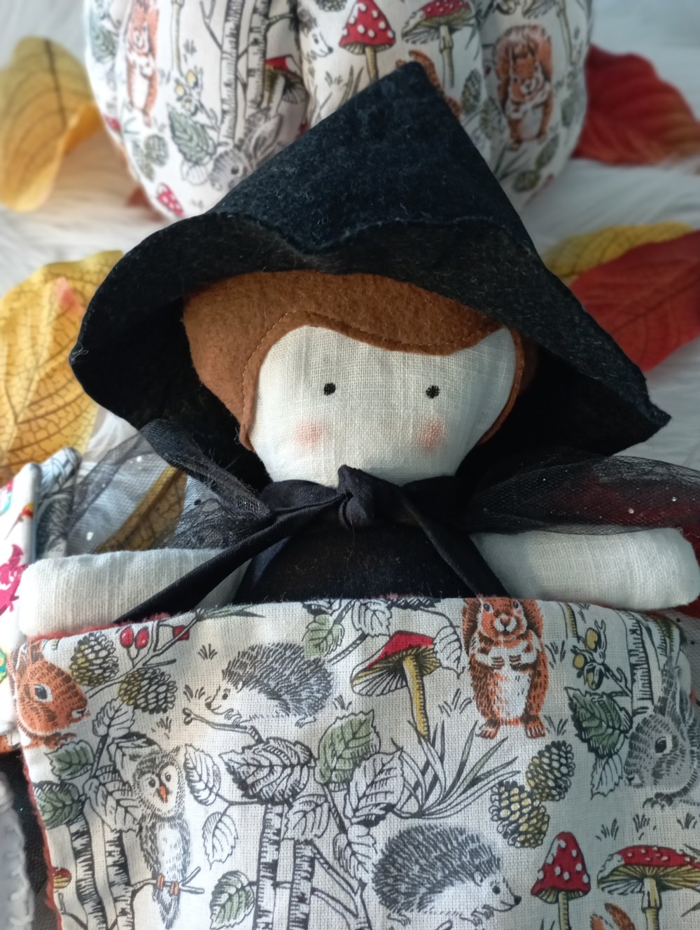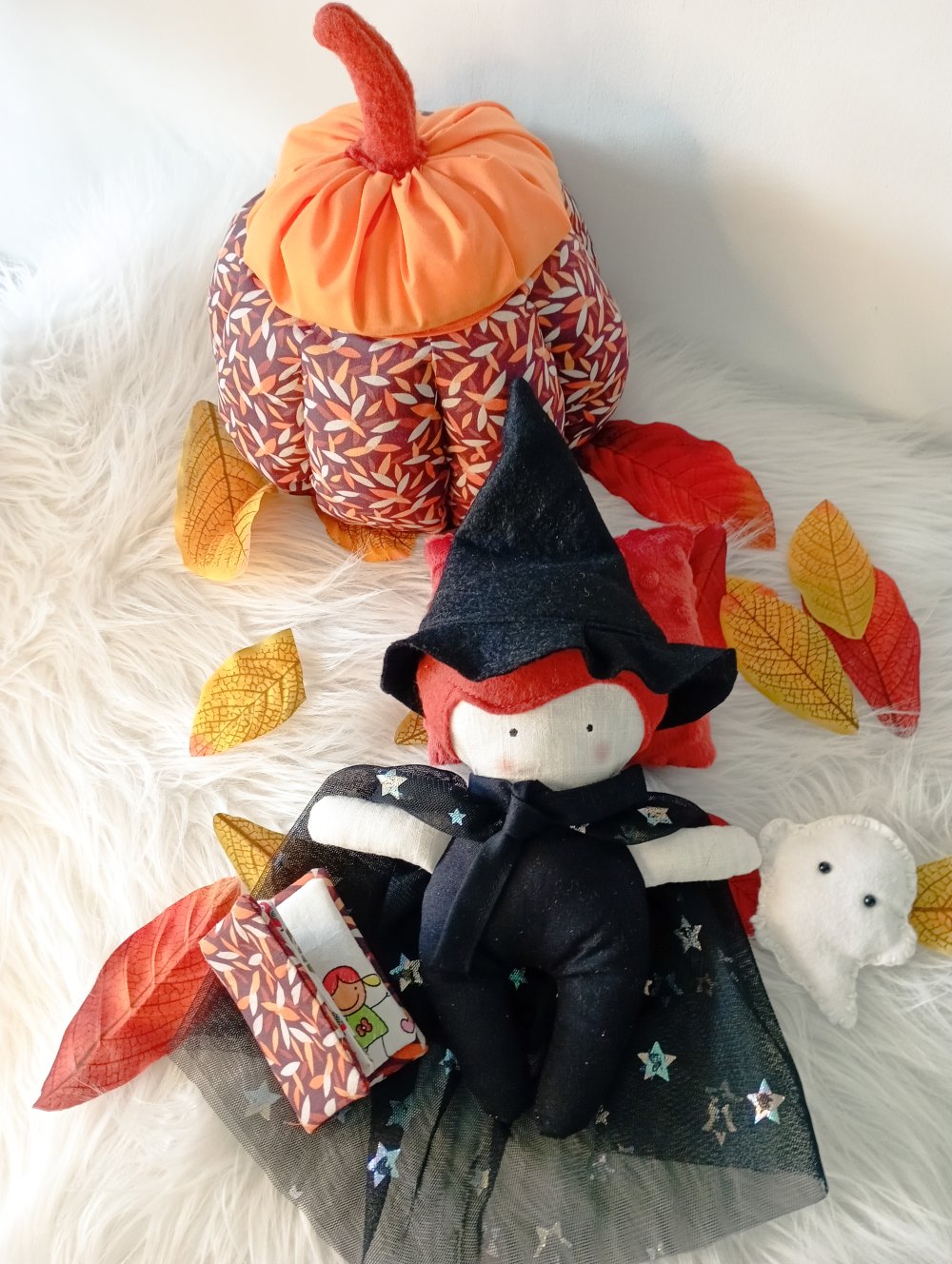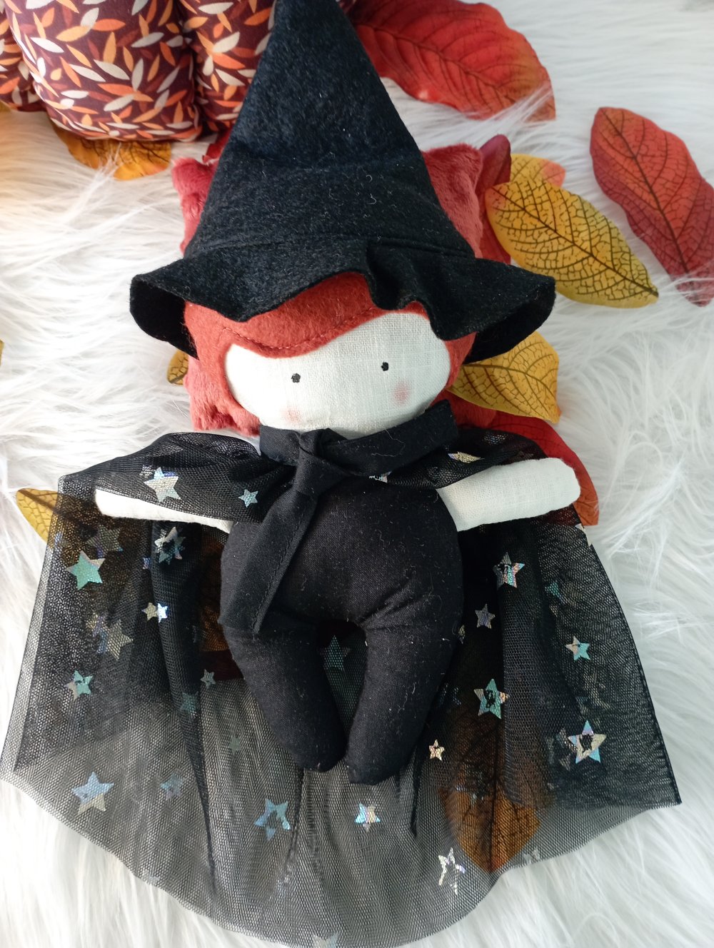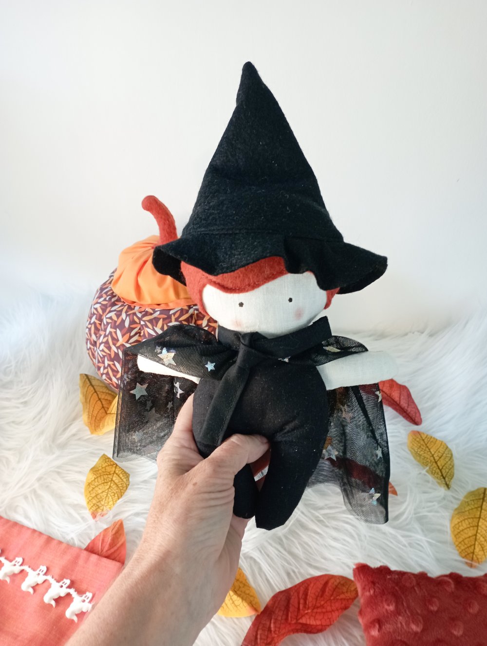 Cette jolie sorcière d'halloween avec sa cape noire étoilés et ses accessoires aideront à faire un rituel avant le dodo.