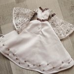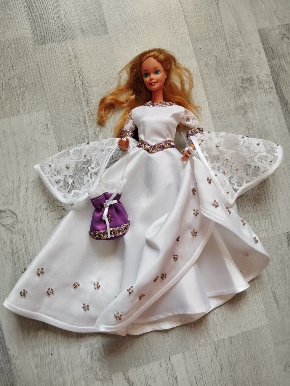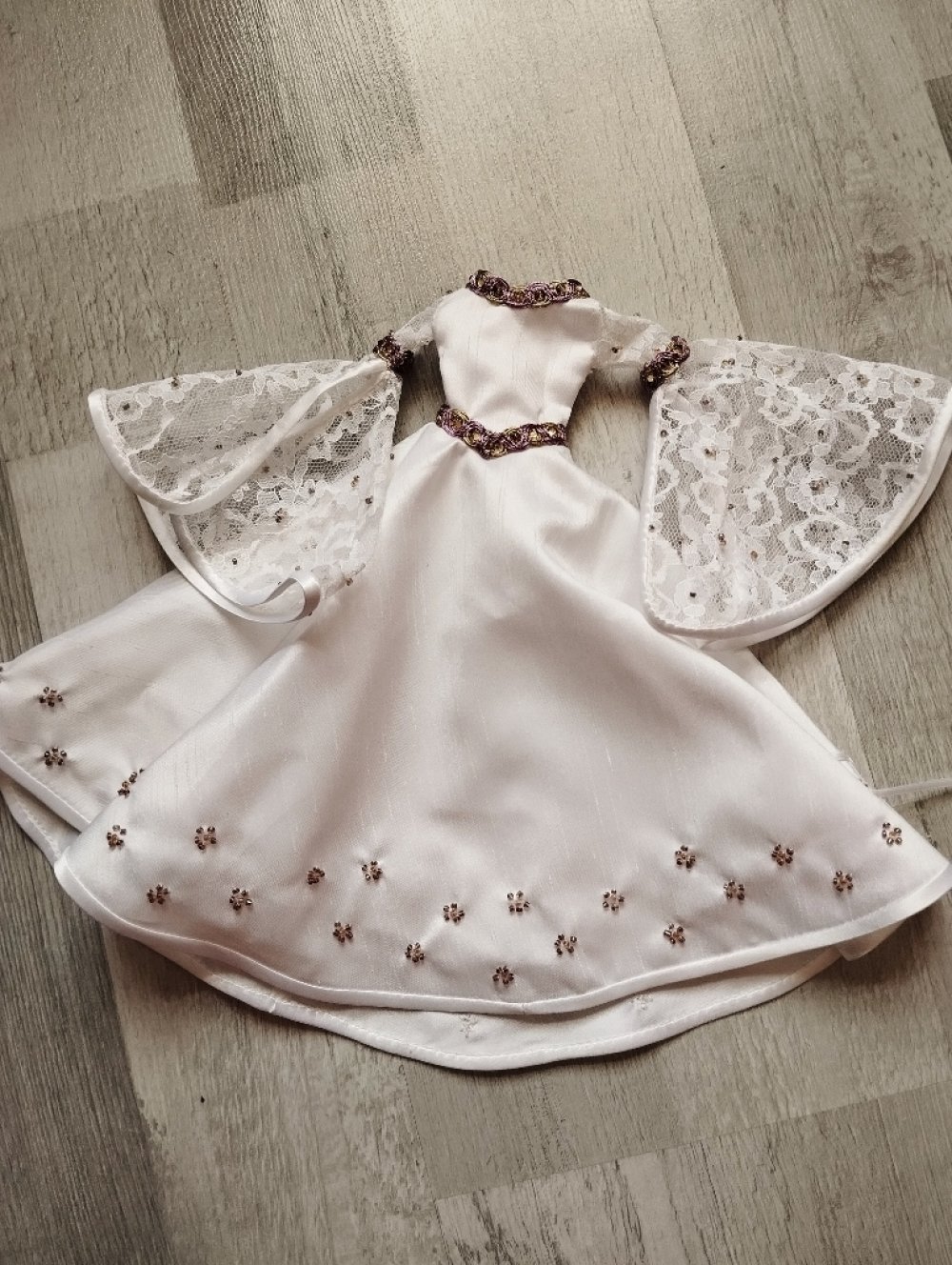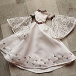 - manches pagode large en dentelle bordées de soie et brodées de perles dorées et mauves