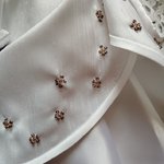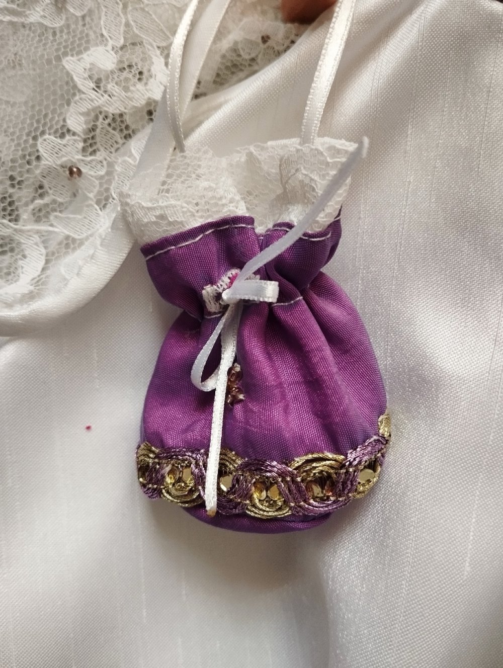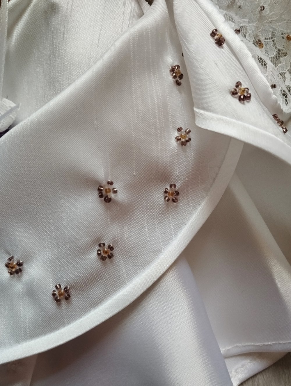 - corsage en soie blanche bordé d'un liséré métalisé doré et mauve