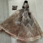 Robe inspirée de la tenue de Marylin Monroe en voile noir rayé doré, doublée d'un jupon court noir, encolure dos-nu et sa pochette assortie