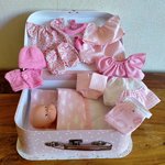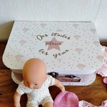 Un poupon Corolle 20 cm (mini Calin) présenté dans une valisette avec son trousseau.