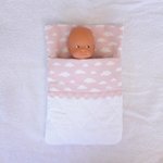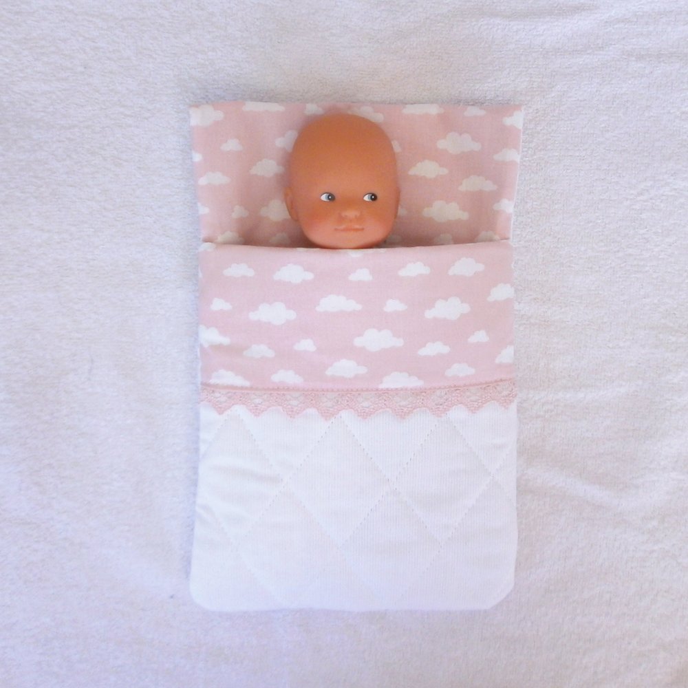 - un sac de couchage en coton matelassé blanc, doublé de coton rose pastel imprimé d'un motif de nuages blancs, avec un revers dans le même tissu, bordé de dentelle de coton rose pastel.