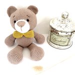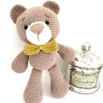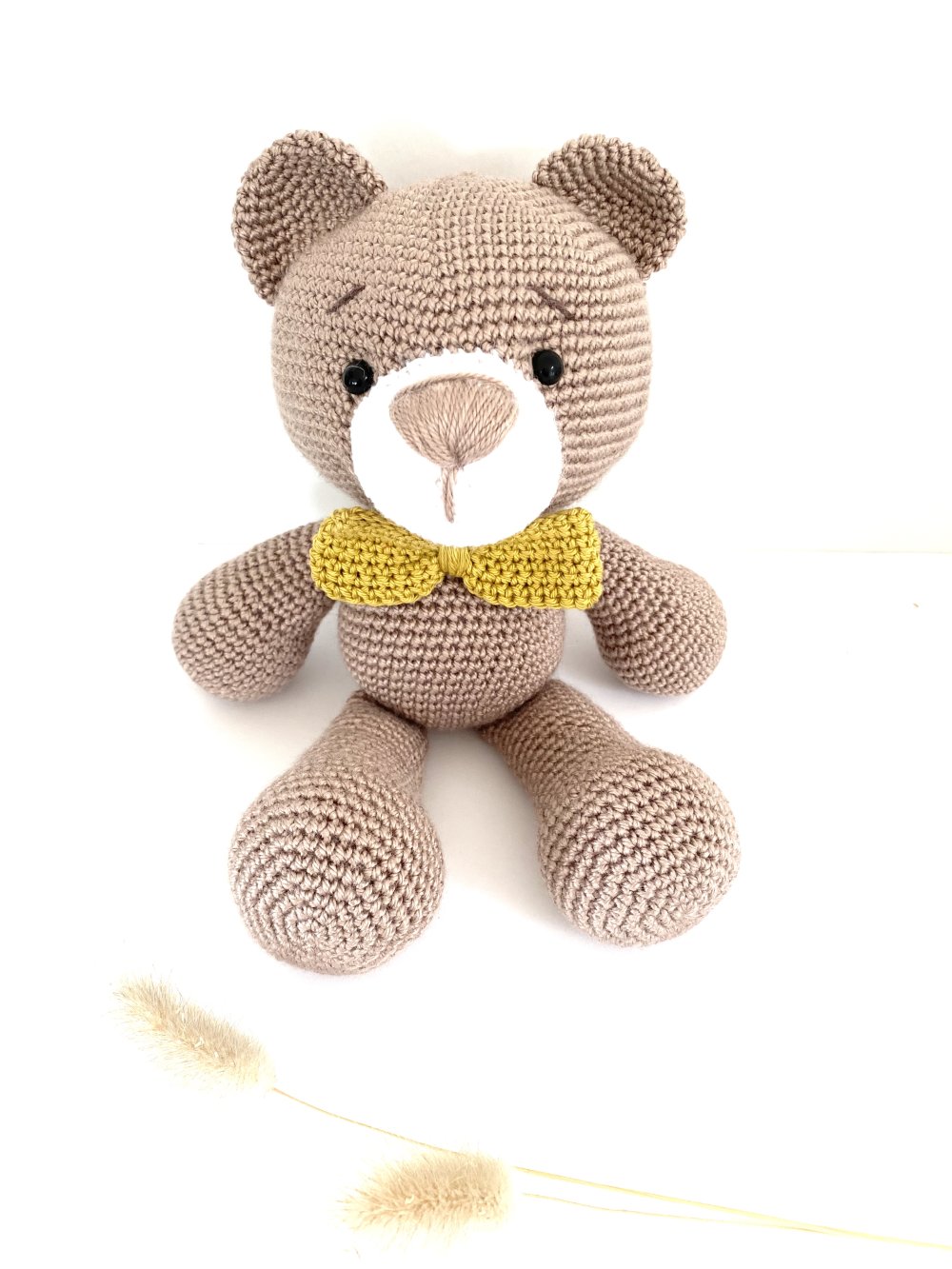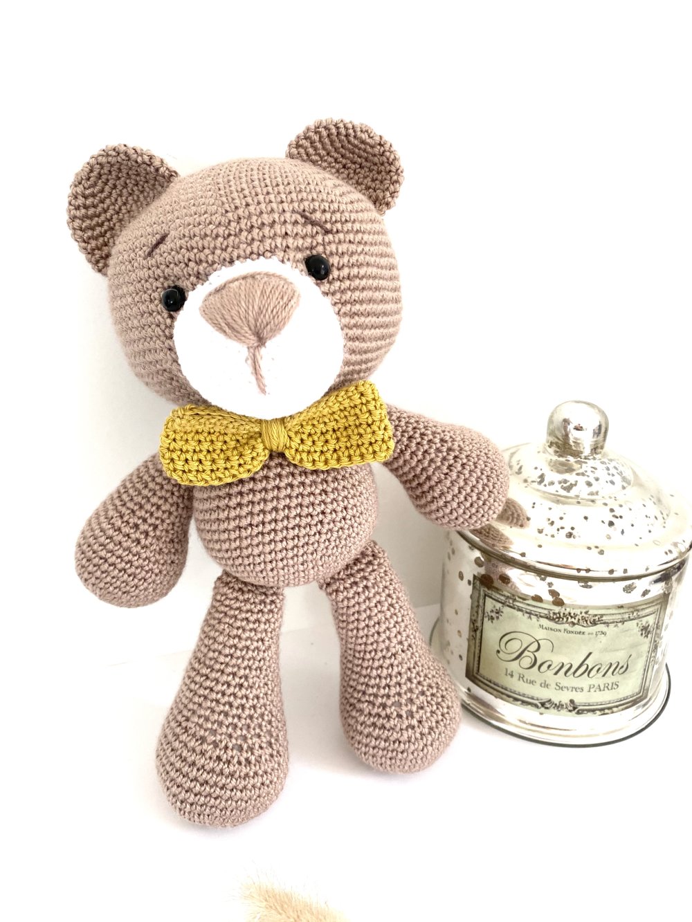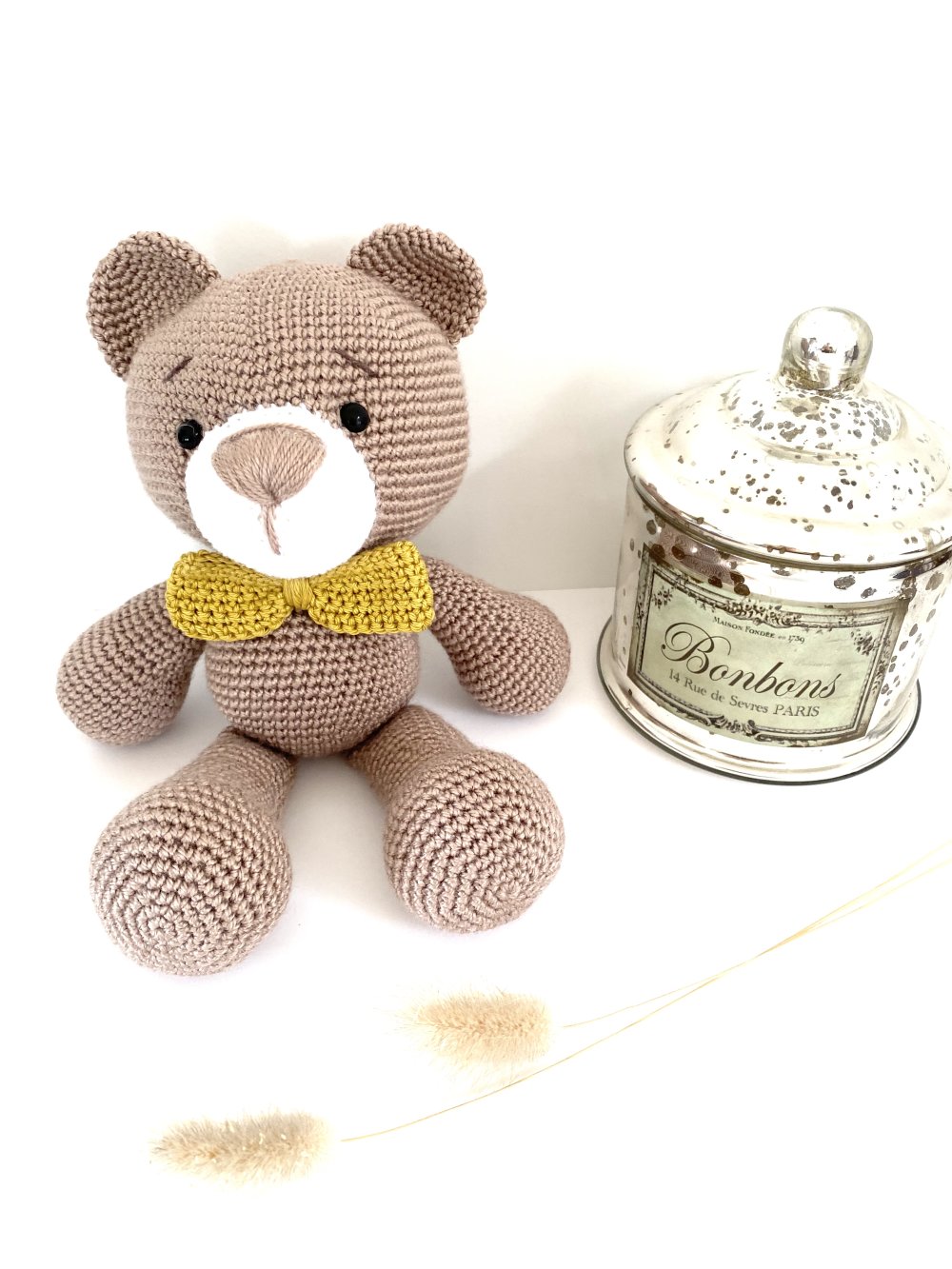 Adorable crochet amigurumi ours Arsène et son beau noeud vert , le doudou parfait pour nouveau-né, bébé ou enfant,
