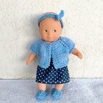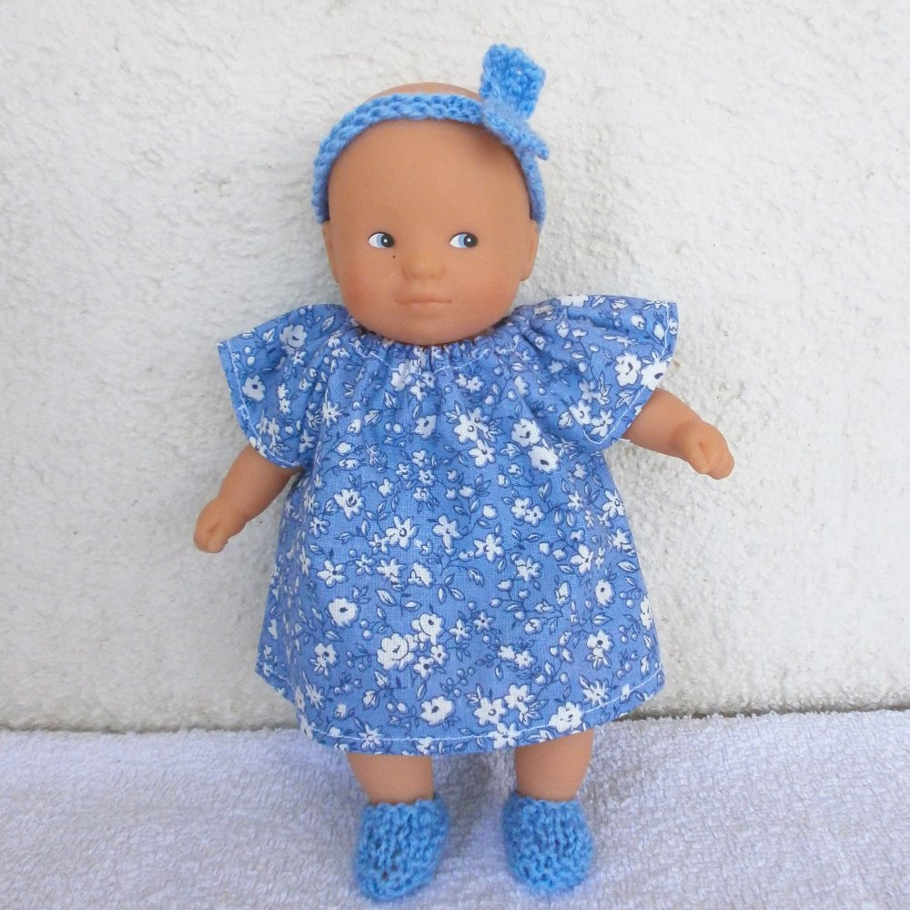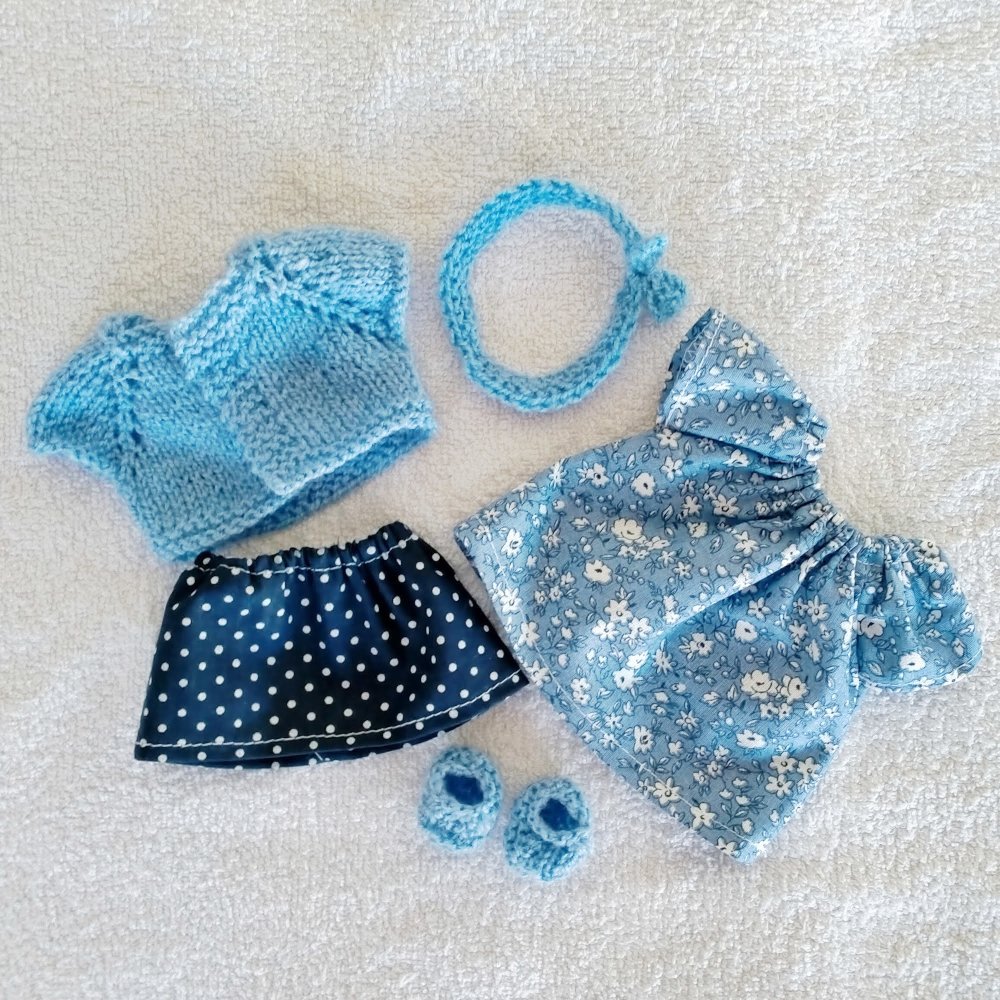 Habits pour mini Calin (20 cm, Corolle) : robe, jupe, gilet, bandeau et chaussons
