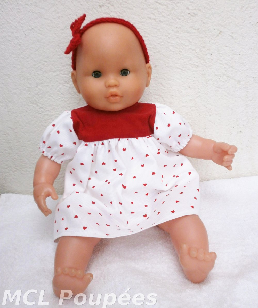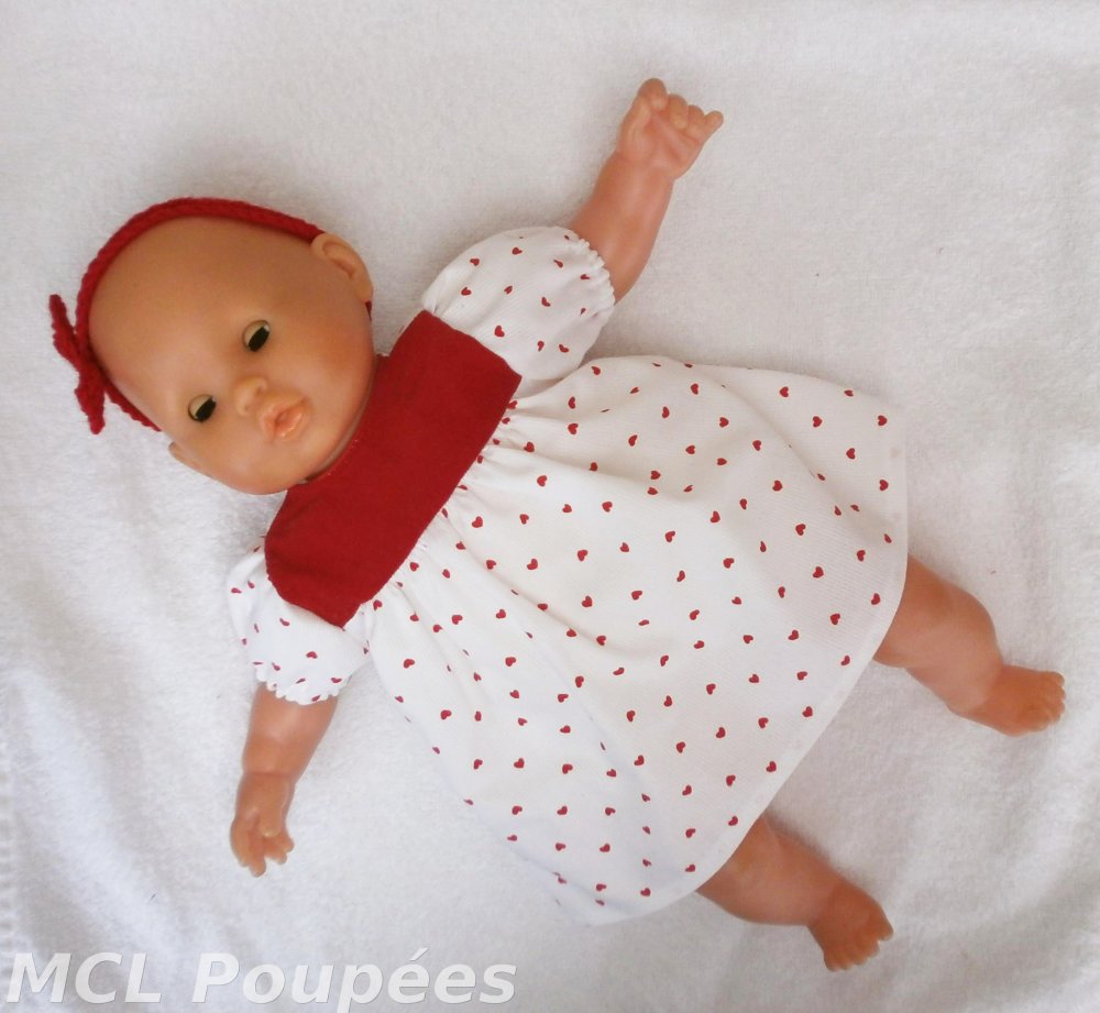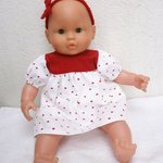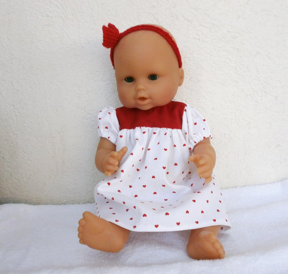 Vêtements pour poupon Corolle de 36 cm : une jolie robe imprimée de petits coeurs rouges avec son bandeau assorti