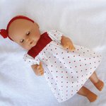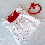Une jolie robe en piqué de coton blanc imprimé de petits coeurs rouges, avec manches ballons et empiècement en velours milleraies rouge. La robe se ferme au dos par du velcro. Elle est accompagnée d'un bandeau rouge tricoté en laine acrylique.
