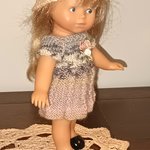 - Une robe manches courtes, tricotée en laine acrylique fine beige et marron, Décorée avec 3 fleurs en tissu .Fermée entièrement dans le dos avec des boutons.