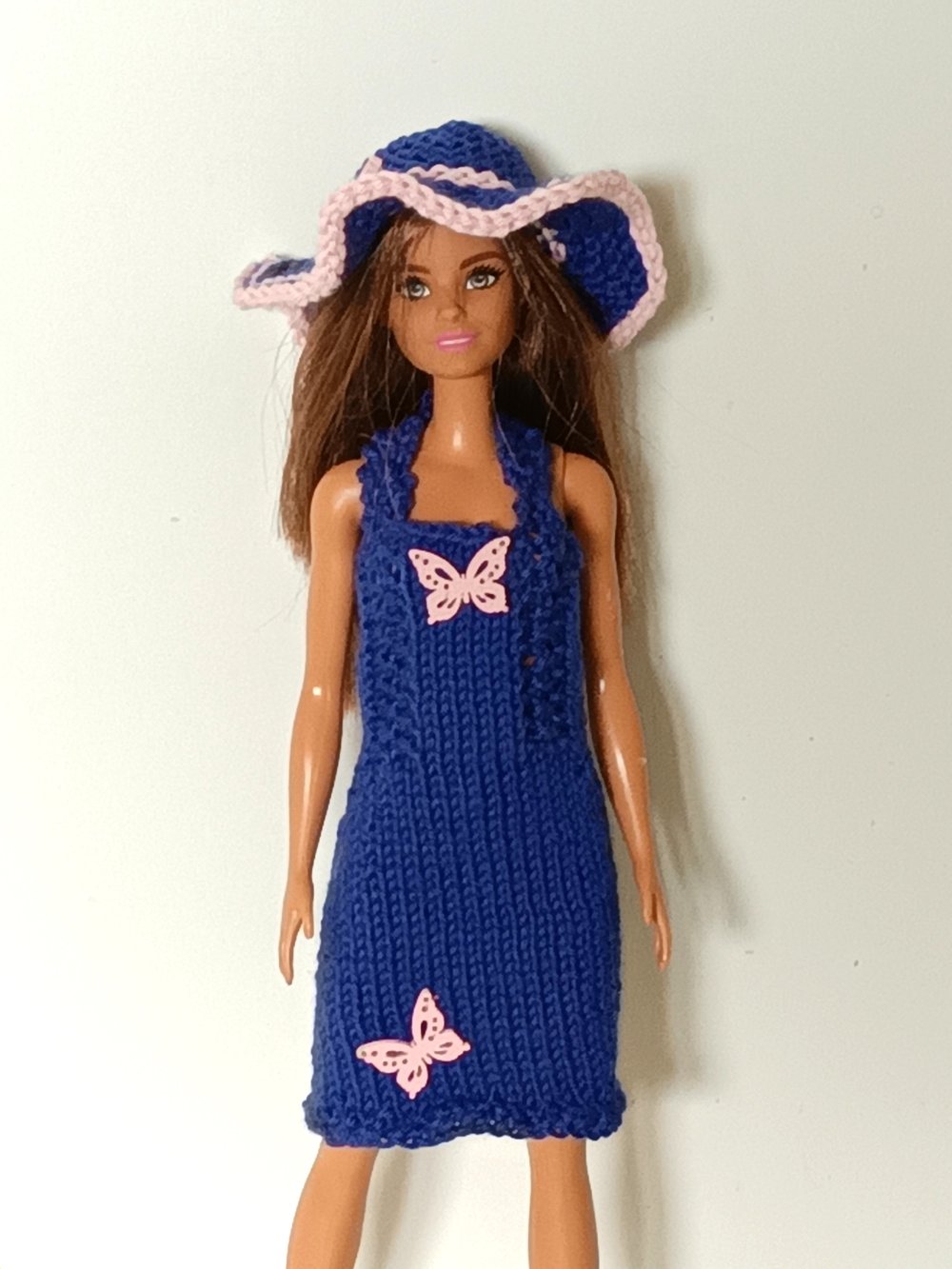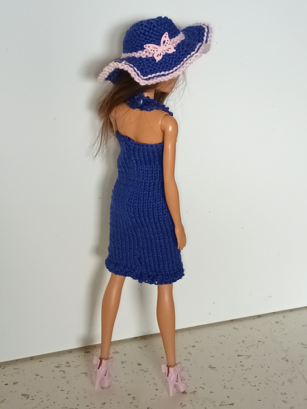 - Une robe dos nu. Bretelles fermées autour du cou avec une pression. Enfilage facile par le bas. Décorée avec des boutons papillons