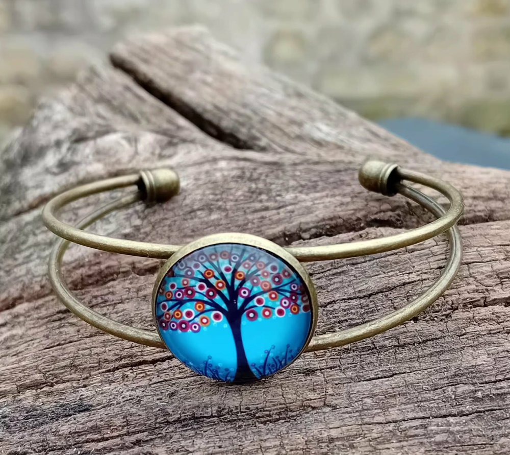 Cabochon en verre illustrant un Arbre de Vie coloré sur fond bleu lumineux.