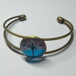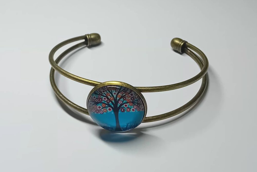 Élément central : Cabochon en verre illustrant un Arbre de Vie coloré sur fond bleu lumineux.