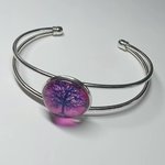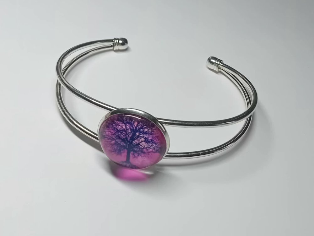Élément central : Cabochon en verre représentant une silhouette d'arbre sur un fond violet et pourpre dégradé.