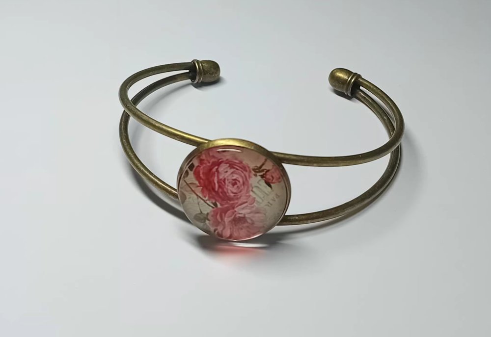 Élément central : Cabochon en verre présentant un motif de roses roses sur un fond d'écriture ancienne évoquant Paris.