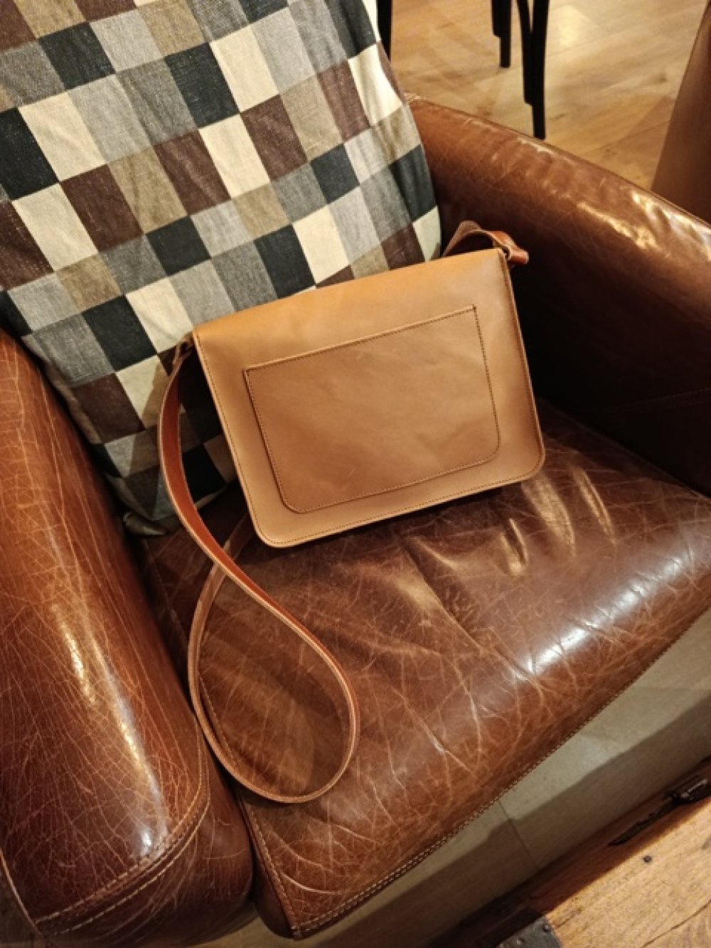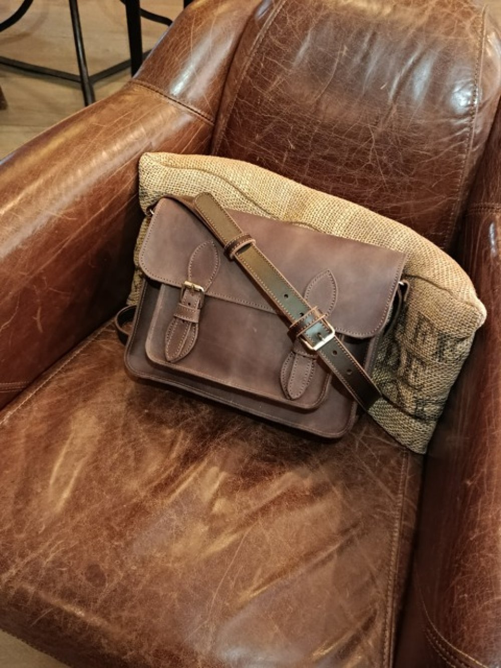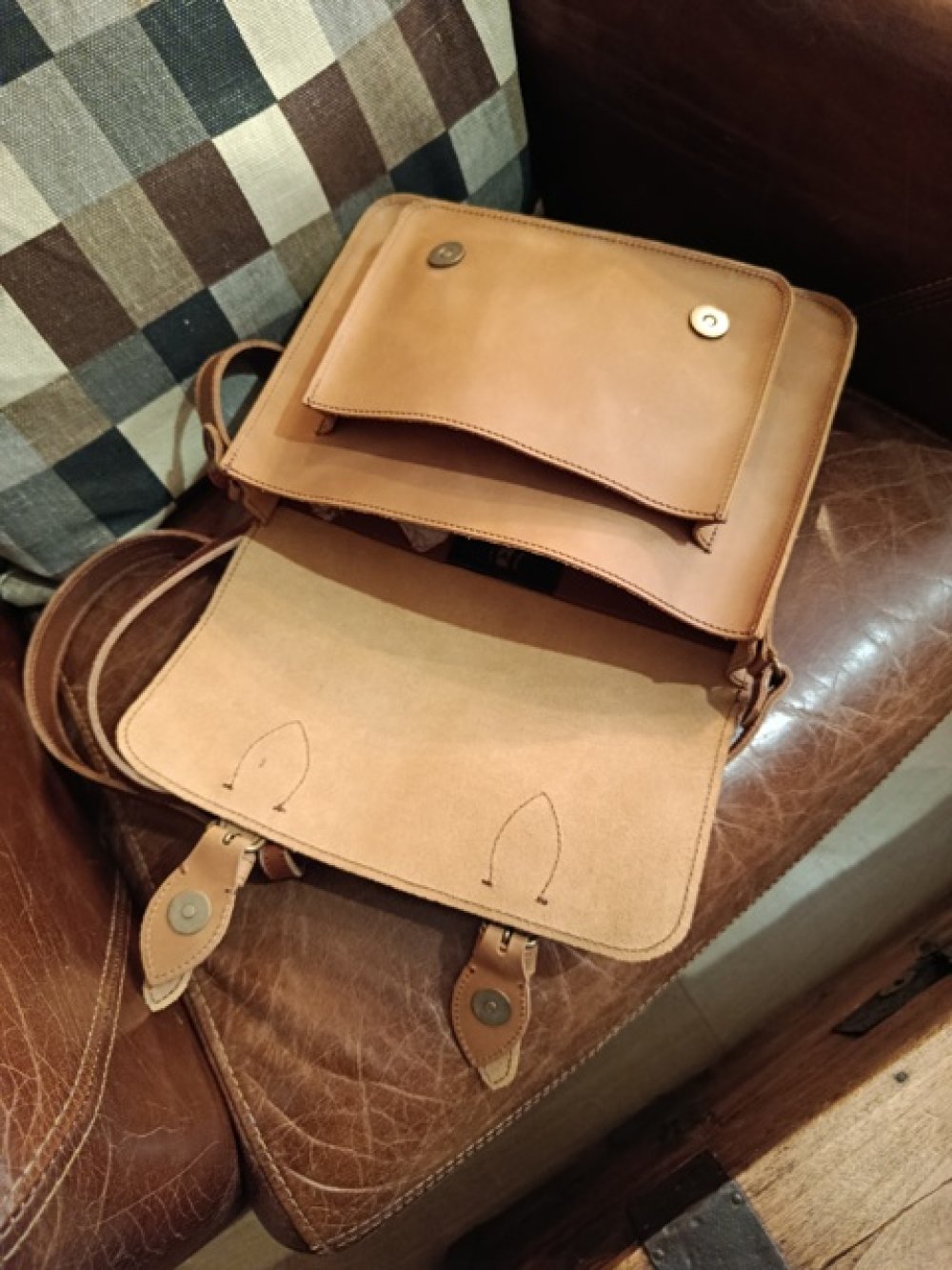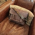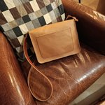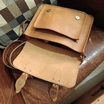 Sac en vachette semi rigide et bandoulière réglable en collet. Dimensions 27cm de large, 22cm de haut et environ 9cm d'épaisseur.