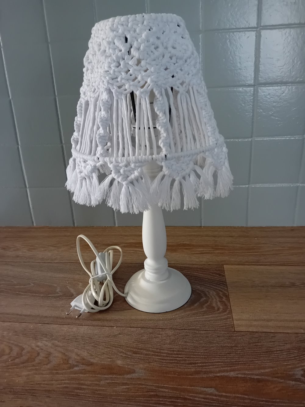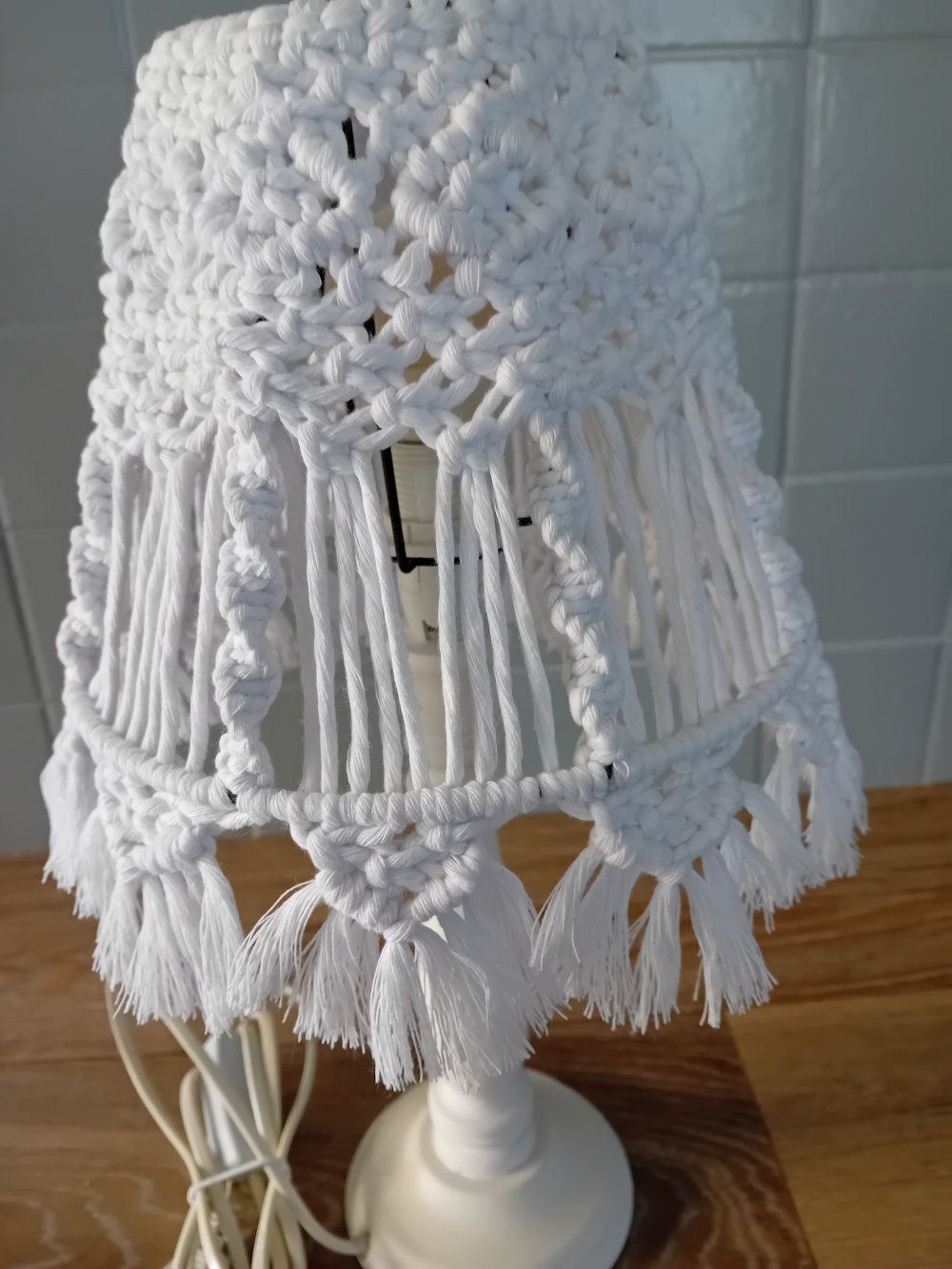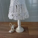 Lampe sur pied en bois et abat-jour en macramé.