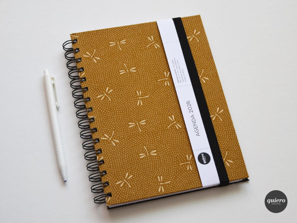 Agenda A5 2026 / Tissu Japonais Libellule sur Jaune / 15x21cm / Idéal pour le bureau