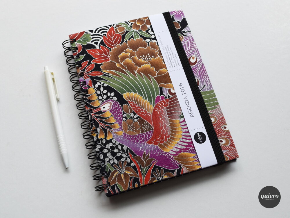 Agenda A5 2026 / Tissu Japonais Paon, argent / 15x21cm / Idéal pour le bureau