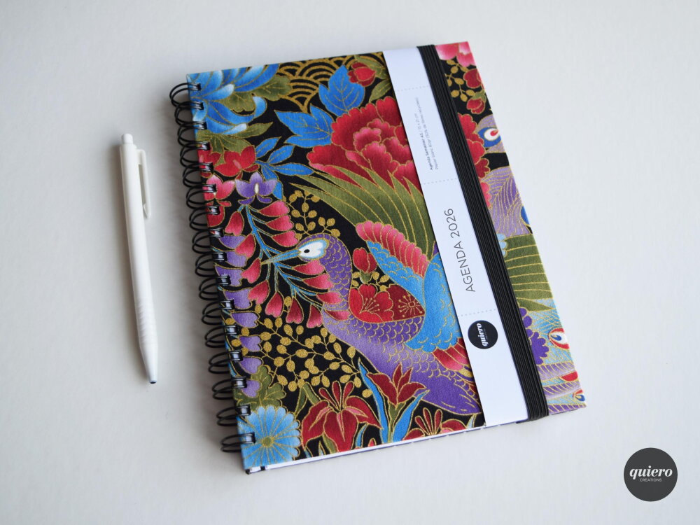 Agenda A5 2026 / Tissu Japonais Paon et fleurs (doré) / 15x21cm / Idéal pour le bureau