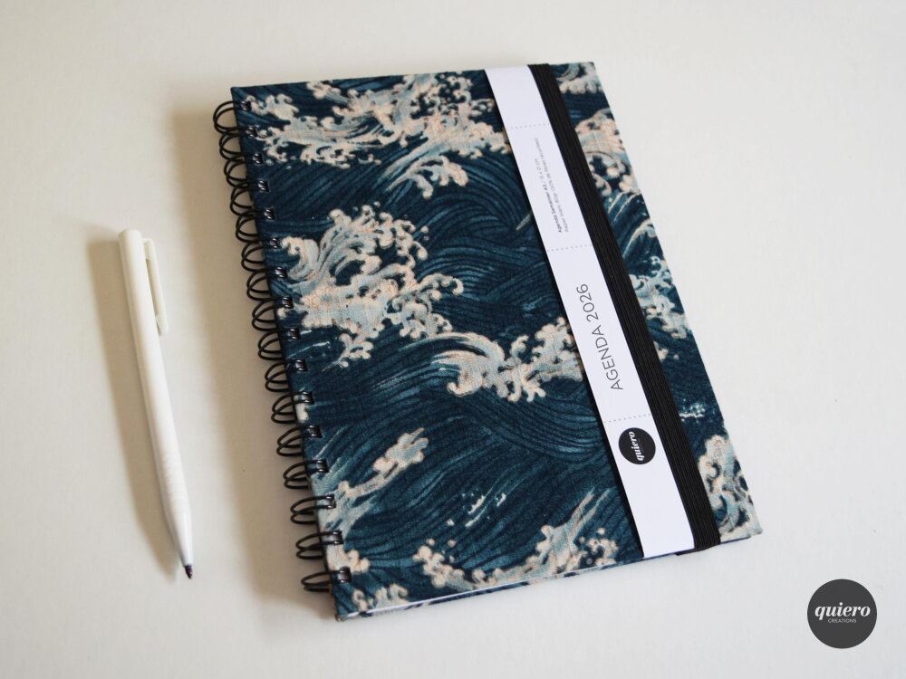 Agenda A5 2026 / Tissu Japonais Vagues Bleu / 15x21cm / Idéal pour le bureau