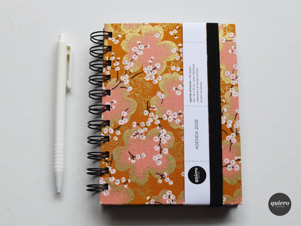 Agenda A6 2026 / Tissu Japonais Cerisier sur Orange / 10x15cm / pour la Rentrée / Idéal pour le sac à main